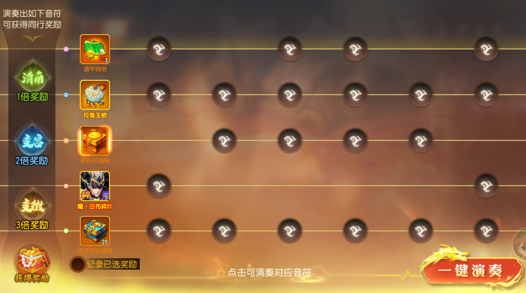 4、开始演奏前主公点击奖励区道具图标可以更换选择的目标奖励,一旦开始演奏(即点亮过任意一个音符)则本首乐曲结束前不可更换目标奖励。
