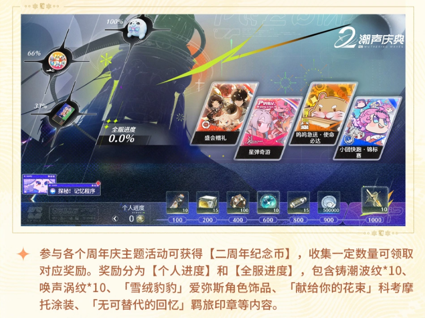 鸣潮周年庆的活动内容丰富多元,兼顾剧情深度与玩法乐趣,为漂泊者们打造了一场沉浸式庆典。本次鸣潮周年庆以专属主题开启版本更新,剧情上解锁全新篇章,带领玩家深入未知区域,解锁更多游戏世界的隐藏真相。同时上线多位全新角色,搭配卡池复刻活动,丰富玩家的养成阵容与玩法选择。