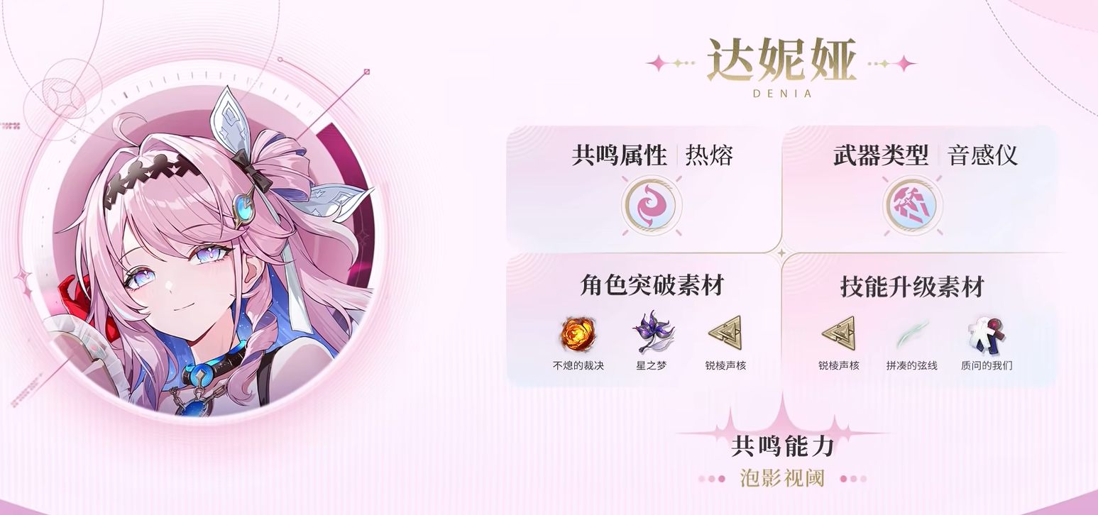 达妮娅是五星热熔属性角色,武器为音感仪,核心定位是聚爆体系专属辅助+副C,也是爱弥斯聚爆队的核心拼图。她兼具强力控场、团队增伤与双形态机制,异能力“泡影视阈”可释放泡泡制造虚质防护,大范围牵制敌人,为队伍创造稳定输出环境。