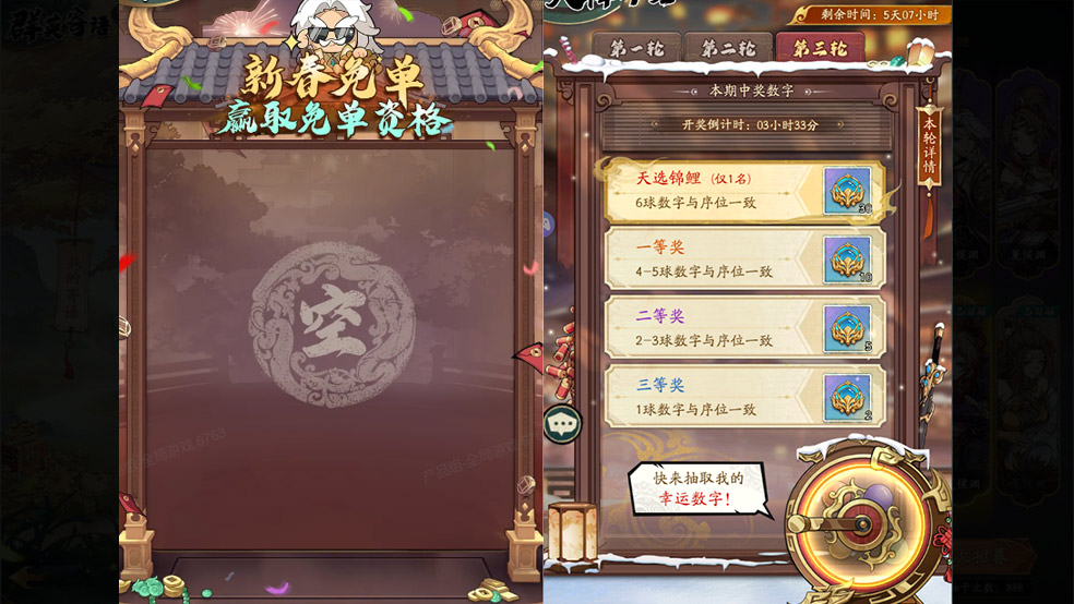 新春特别活动"天选锦鲤"震撼开启——每日登录即可领取专属幸运编码(唯一),每晚20点准时开奖,根据您的数字与中奖数字的匹配程度,将发放不同等级的奖励。天选锦鲤、一等奖、二等奖、三等奖等您来拿!