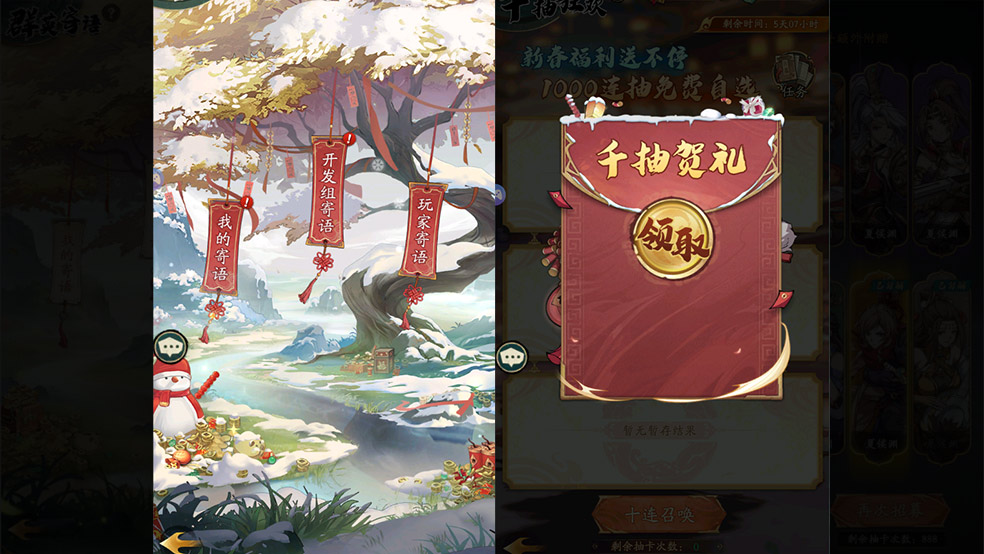 新春佳节,怎能少了寄语传情?发送您的新春寄语,查看策划团队的温馨祝福,即可领取丰厚的道具奖励。