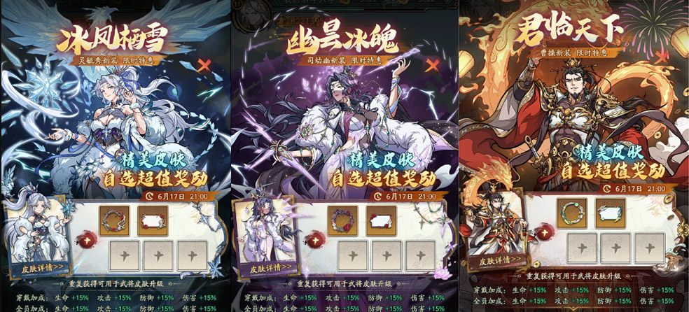 新年就得穿新皮肤!三款超酷外观——冰凤栖雪、幽昙冰魄、君临天下霸气登场!解锁激活增加生命、攻击、防御、伤害属性加成,战斗力直接拉满!喜欢哪款换哪款,新年战袍选它们,气场颜值双在线!