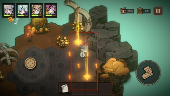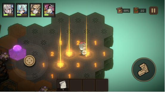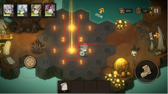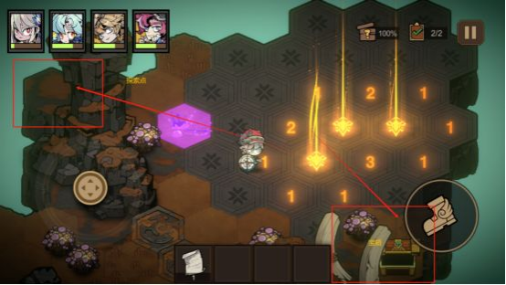1.在模拟训练中的有的特殊区域是拿神秘矿石资源的。采矿石的时候按中三个点就可以了,不要按着不松手,另外这个矿石采完会失血,所以在闯关的时候选择一些回血的技能牌。