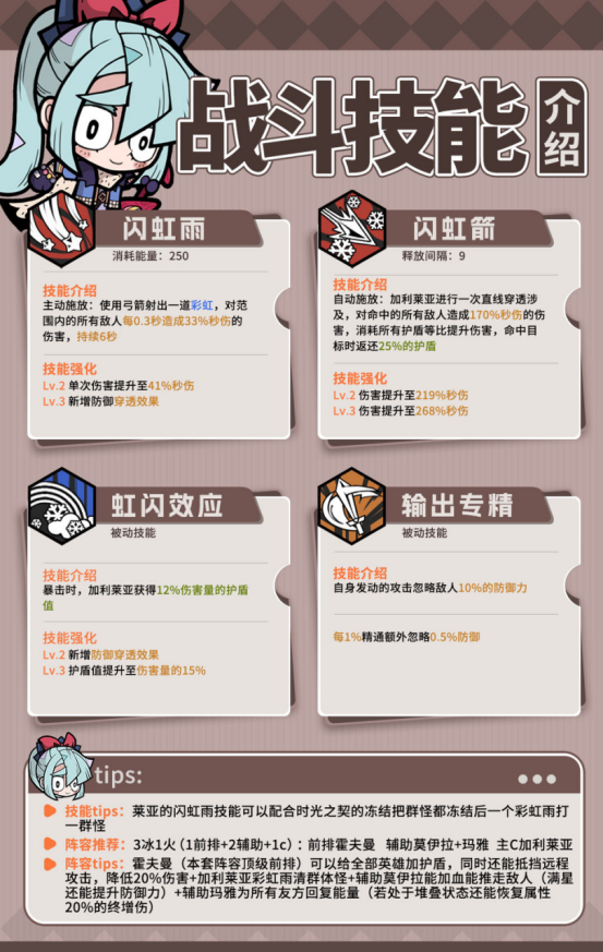 虽说是偶像团体,但其中成员个个都是实力强劲的高级冒险者,而加利莱亚则是其中一位使用弓箭的冒险者。她使用一把自制的弓,凭借着加利莱亚自年幼时日复一日的箭术练习和冒险者工会高阶魔法附魔的加持,以至于加利莱亚在战斗中可以射出拖着彩虹尾迹的箭矢。这极大的提升了加利莱亚在普通冒险者当中的人气。