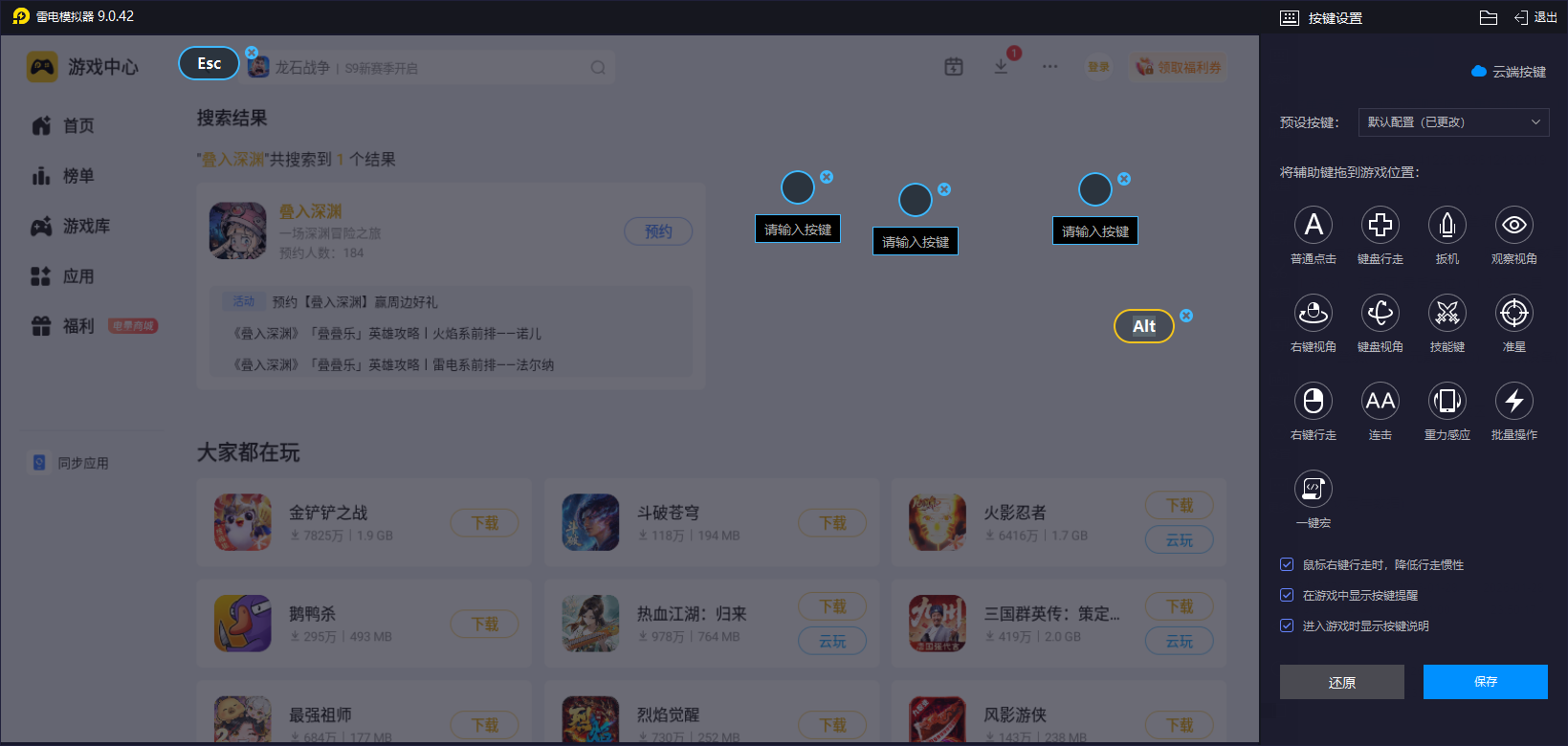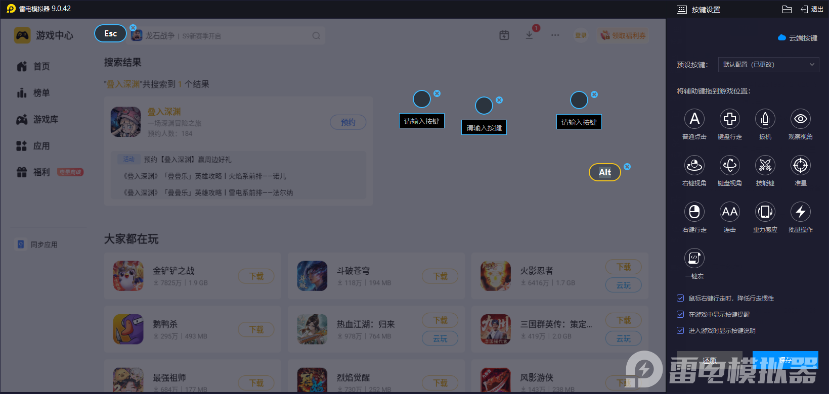 值得一提的是,雷电模拟器支持自定义键位映射,大家可以主动通过键盘与鼠标组合来实现精准操控角色堆叠、技能释放及装备树打造等复杂操作,而且为大家提供了热门游戏的预设键位方案,减少自身的上手难度。