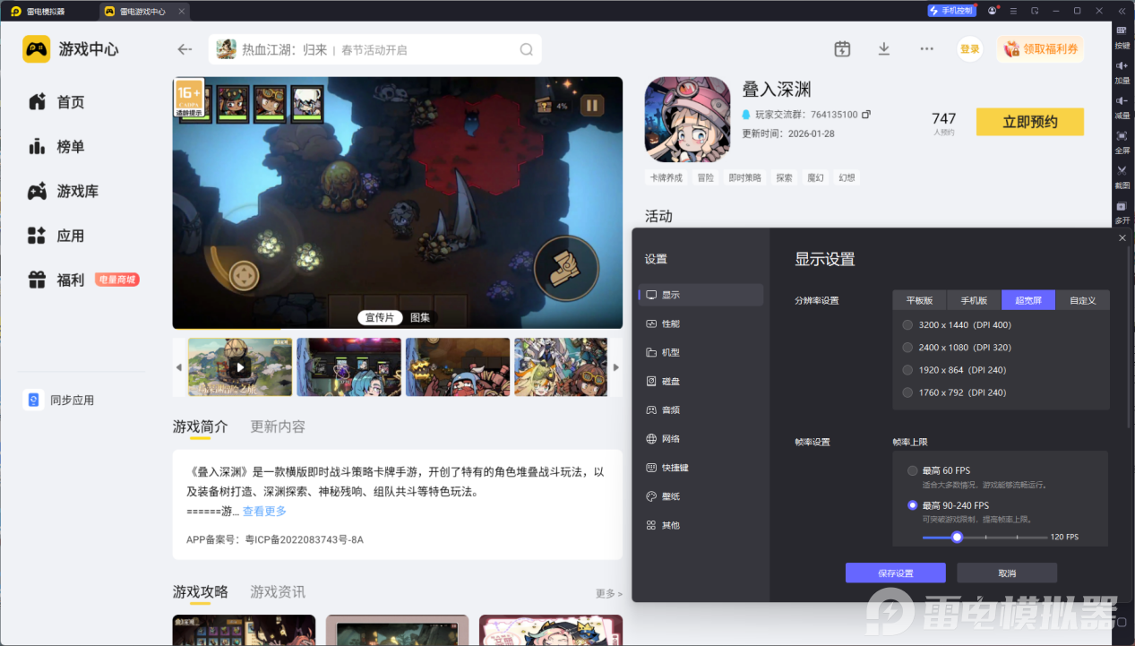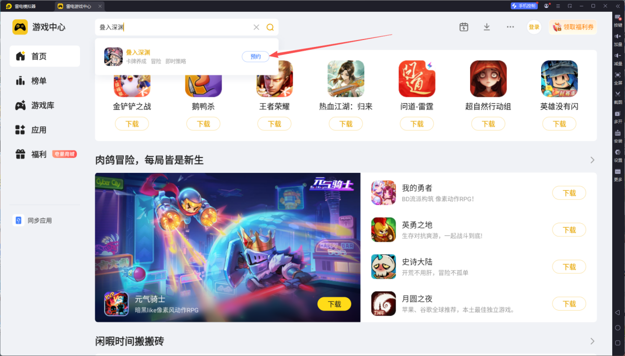 启动雷电模拟器后,打开首页的雷电游戏中心,在搜索栏输入“叠入深渊”当前游戏处于预约阶段,进入详情页点击预约,开服后会第一时间提醒,届时可直接在模拟器内完成下载与安装。