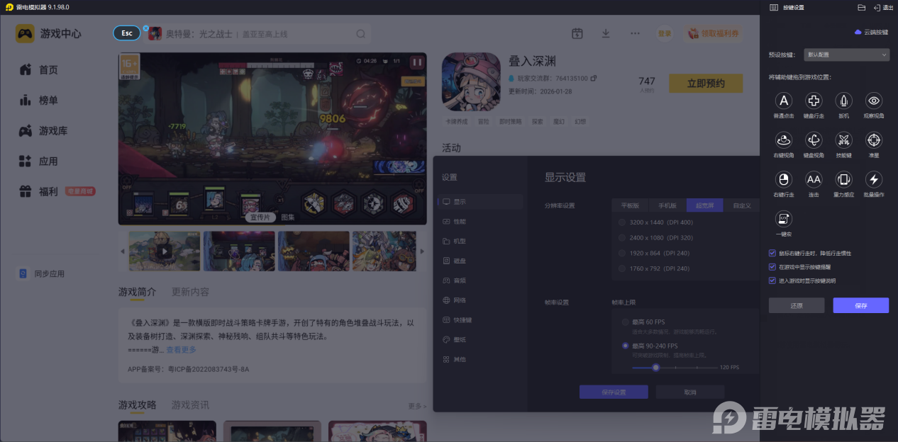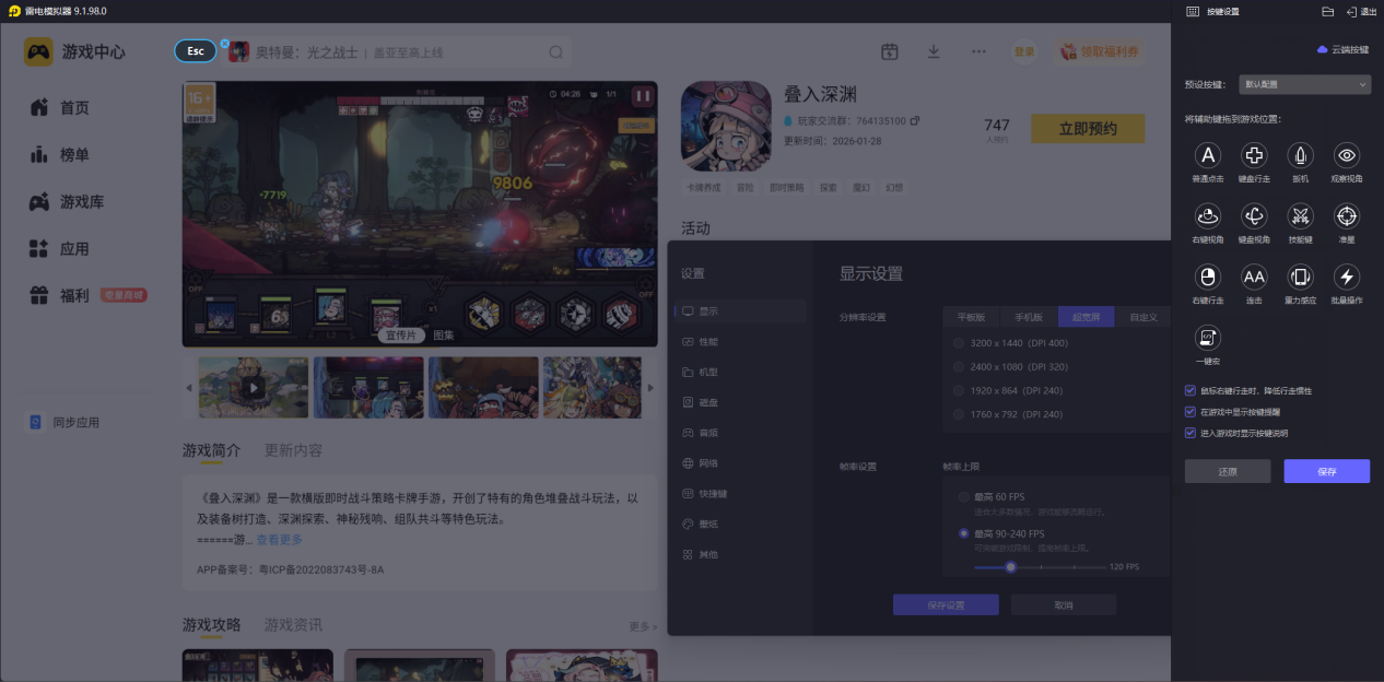 它支持自定义键鼠映射,操作更精准顺手,长时间游玩也更轻松。模拟器内可直接预约与下载游戏,开服自动更新安装,流程简洁省心,是体验叠入深渊电脑版的实用助手。