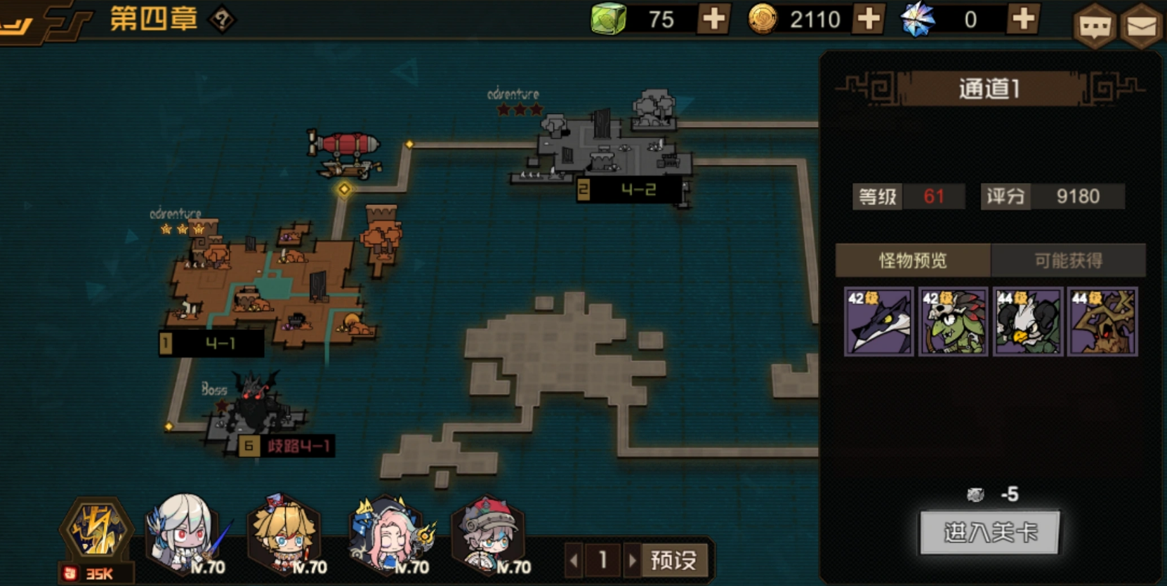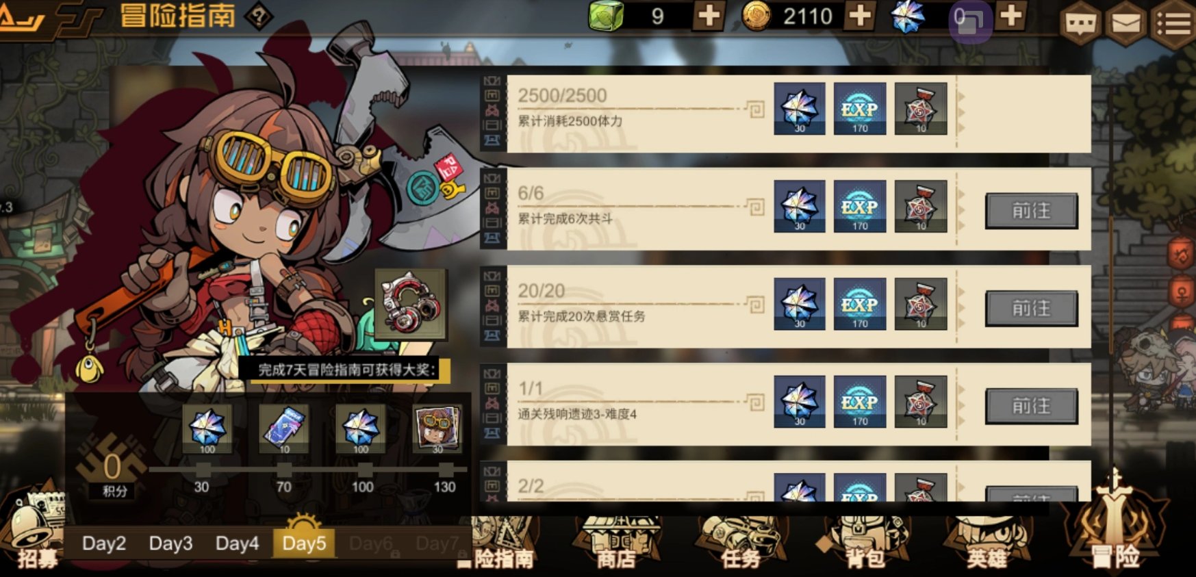 一开始的时候,我们重点还是在根据指引来完成一些基本操作,比如通关第一章第一关即可解锁“冒险指南”,优先完成冒险指南第一天的5个章节,快速提升等级,解锁后续主线任务。