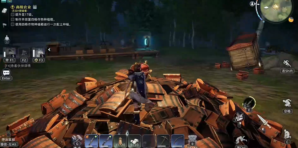 可以去主动携带普通木料等作为诱饵,到达土丘顶部与吞噬者互动,沿返家路径间隔投掷材料,确保每段距离在宝箱怪可视范围内即可,若基地过远,也可临时迁移家园至森林南岸附近提高效率。