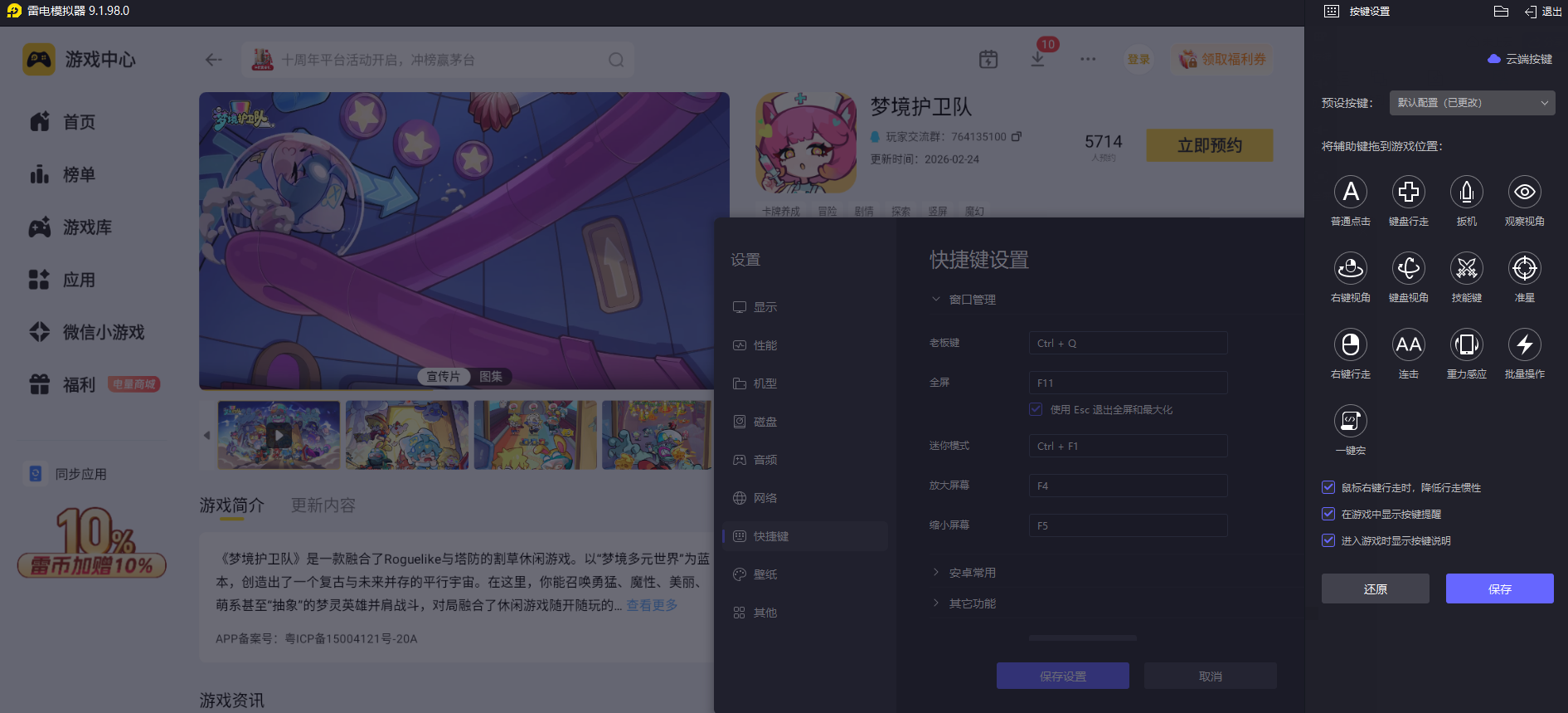 《梦境护卫队》战斗里要频繁切换梦灵、选择天赋、调整站位,满屏敌人来袭时需要快速做出反应,手机屏幕小、按键集中,手指操作容易误触,长时间玩也会觉得手酸。雷电模拟器支持键盘鼠标自定义按键,操作响应更跟手,技能释放和角色切换更精准,长时间玩也能保持流畅的操作手感,刚好匹配游戏的高频操作需求。