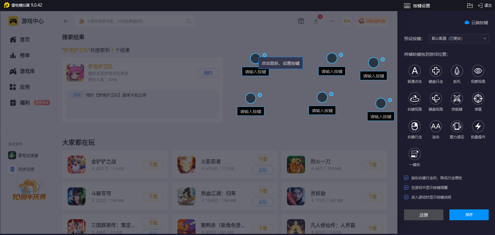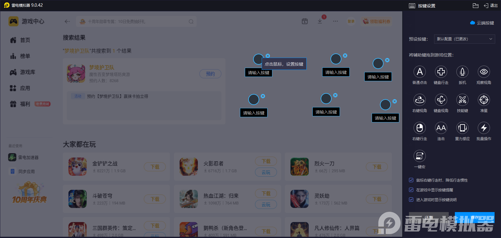 在实际体验的时候,小编建议玩家可以去使用雷电模拟器来帮自己,该软件提供的按键自定义功能很出色,玩家可根据角色强度定位与操作需求,来选择合适的键位操作,这样一来也就不用担心会有物理按键不顺手的情况,可以实际精准触发,比如,对于兼具承伤与控制的防御型角色亚瑟,可将突进、击飞控制技能绑定组合键,同时将护盾释放绑定鼠标侧键,实现承伤与控制的无缝衔接,让前排的控场与保护能力得到充分发挥,避免因触屏误触导致关键技能释放失误。