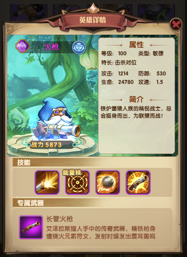英雄定位:火枪作为联盟阵营的输出核心,可以优先攻击对称位置的敌人,快速击杀敌人;在对战模式有着极强的战斗力!!