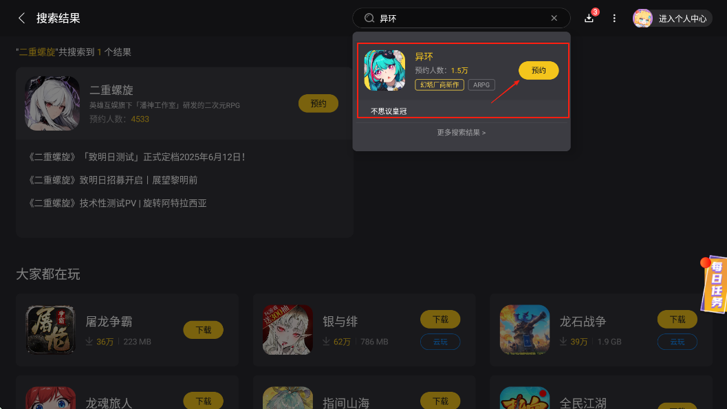 当然了,手机发热的话,自己那在手里也不舒服,而且时间久了,手机电量高危也很头疼,所以小编的建议是可考虑,打开电脑上的“雷电模拟器”来运行,没有的朋友可通过官网来搜索下载,登录进入后,直接在雷电游戏中心搜索游戏来预约即可,具体如下图所示。