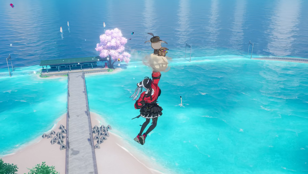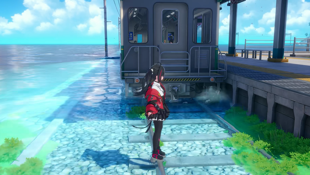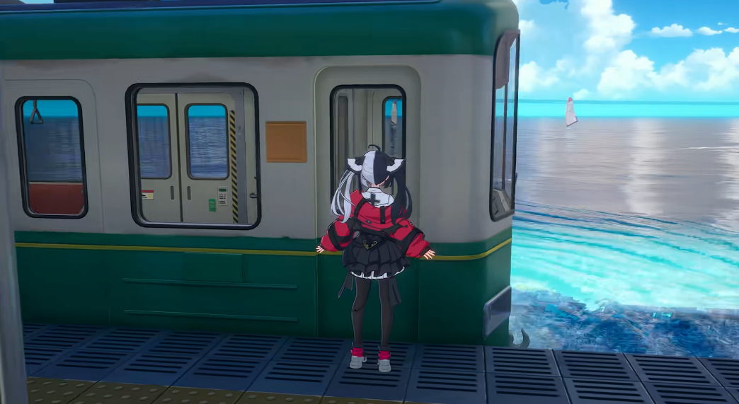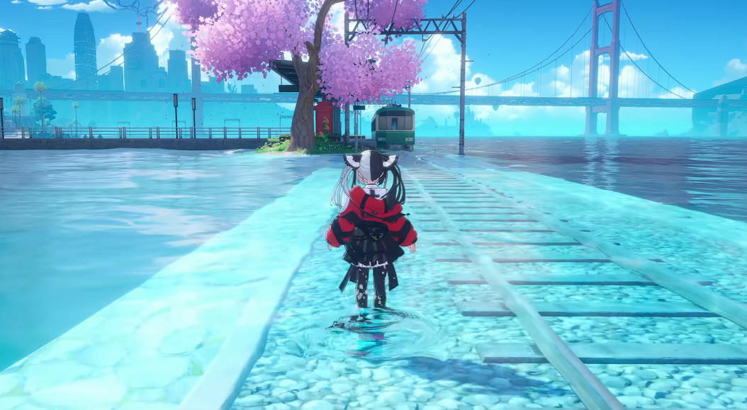 作为水上玩法的一个重点所在,玩家可在樱花环绕的水边车站等待列车到来,,列车外观融合复古与未来元素,带来梦幻般的视觉享受,当我们成功的登上列车后,就能通过观景窗欣赏水域风光,既能坐在车厢内感受科技感布局,也可站在车顶全方位观赏风景。