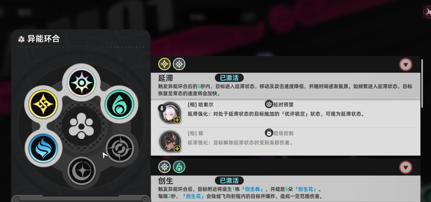 入场角色释放的入轨攻击本身具备较高伤害,命中敌人后会立即触发异能环合效果,其中光系与灵系组合会触发坼绽,生成1株创生株并绽放5朵创生花,创生花每2秒飞向目标爆炸造成范围伤害,灵系与咒系组合则触发覆纹,使目标在12秒内受到灵系或咒系伤害时额外承受一次等量的联袂邀击。