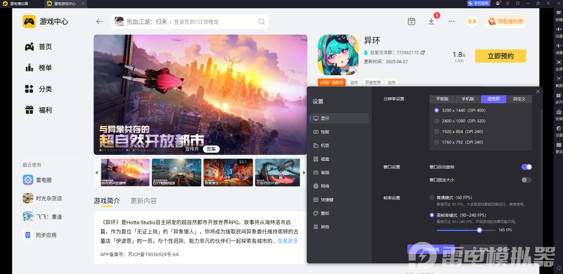 雷电模拟器能让《异环》的画面优势充分展现。它支持4K分辨率和165稳定帧率设置,电脑大屏搭配超宽屏模式,能呈现更多游戏细节,不管是都市场景的精细光影,还是技能释放的炫酷特效,都能清晰呈现。高清画质下,游戏的动态天气系统和角色建模也更具沉浸感,让探索过程更有代入感。