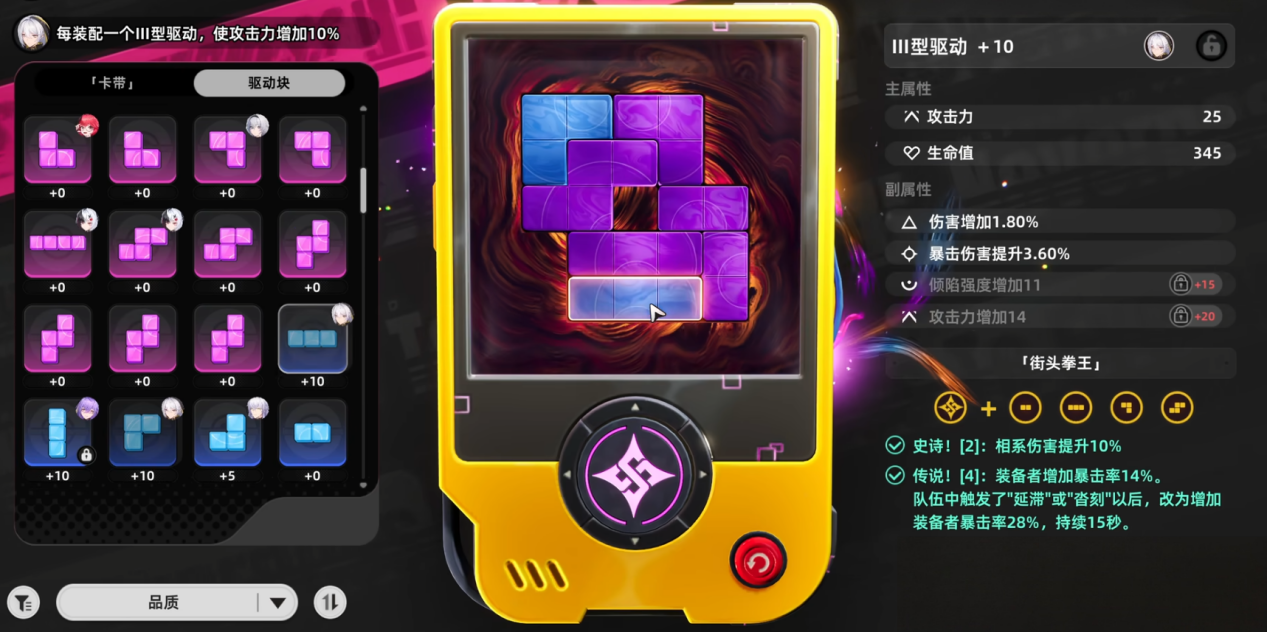 装备包括空幕、卡带和驱动块。空幕下半部分装卡带,需组合成完整图案触发套装特效;上半部分装驱动块,可根据需求搭配“暴击率”“能量恢复”等核心属性。多余装备可通过“数据熔炉”重构,锁定关键词条提升实用性。