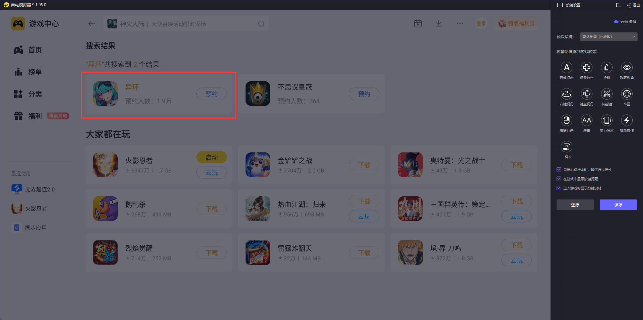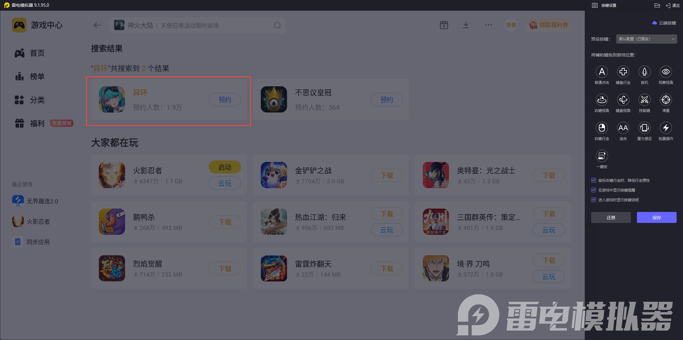 游戏中早雾的聚怪控场、阿德勒的远近切换都需要精准操作,手机虚拟摇杆易出现误触、反应延迟。雷电模拟器可自定义按键映射,键盘控制移动更灵活,鼠标点选技能目标更快,还能设置一键宏实现异能连招,完美适配异环的倾陷值战斗机制,操作精度大幅提升,轻松打出流畅技能衔接。