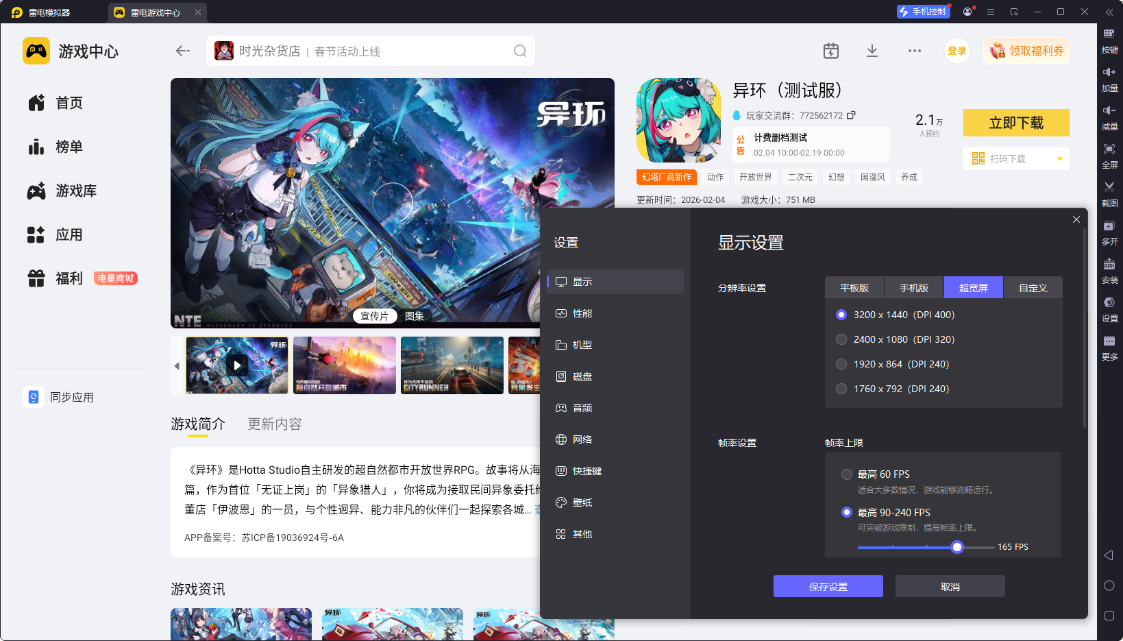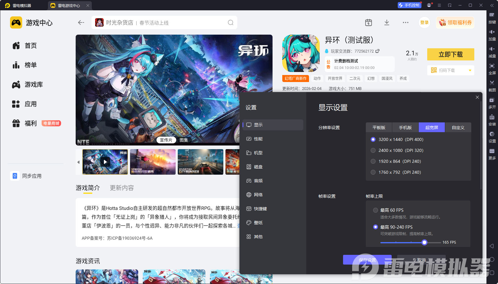 高清大屏,细节拉满:异环的都市开放世界场景细腻,异环翳的影子形态特效、技能光影效果丰富,手机端屏幕狭小易忽略关键细节,还可能因发热导致帧率暴跌至20FPS以下。雷电模拟器支持4K高清画质输出,搭配多核优化技术,可稳定维持120FPS流畅帧率,无卡顿、无掉帧,让异环翳的每一次技能释放、每一次影子位移都清晰可见,轻松捕捉敌人动作,提前预判技能,提升操作容错率。