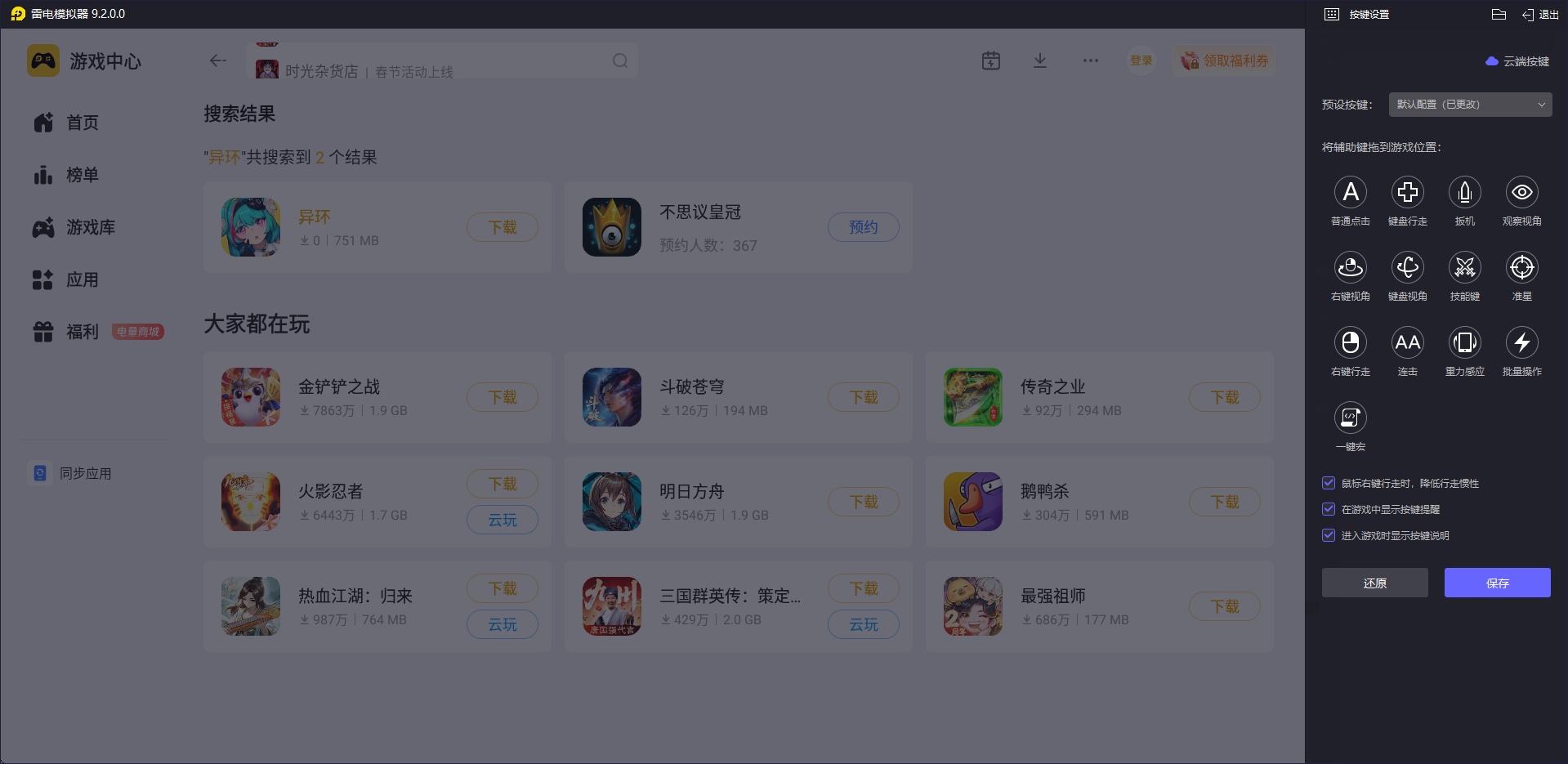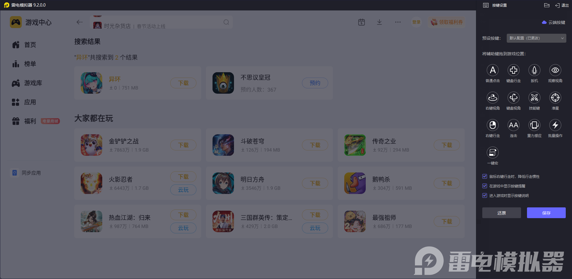 键鼠操控,精准流畅:异环翳的核心优势在于灵活位移和连招衔接,手机虚拟摇杆操控精度低,切换影子形态、衔接普攻与技能时易出现误触,影响连招流畅度。雷电模拟器支持键鼠自定义映射,键盘方向键控制移动比虚拟摇杆更灵活,鼠标点击精准释放技能,可轻松实现“影子位移→小技能破甲→普攻连段→大招收尾”的整套连招,操作精度提升200%以上,完美发挥异环翳的机动性优势。