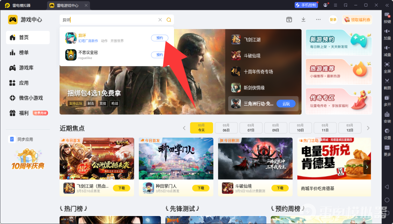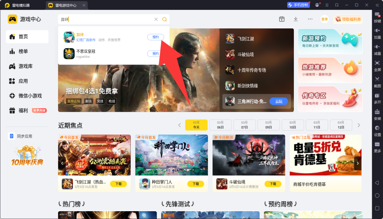模拟器安装完成后,双击图标启动雷电模拟器,在主界面找到并进入内置的游戏中心模块,在游戏中心的搜索栏中准确输入异环进行查找,即可点击预约,等到后续游戏可以预下载时,模拟器会有提醒,到时就可以提前下载好游戏,等游戏正式上线就可以快人一步游玩了。
