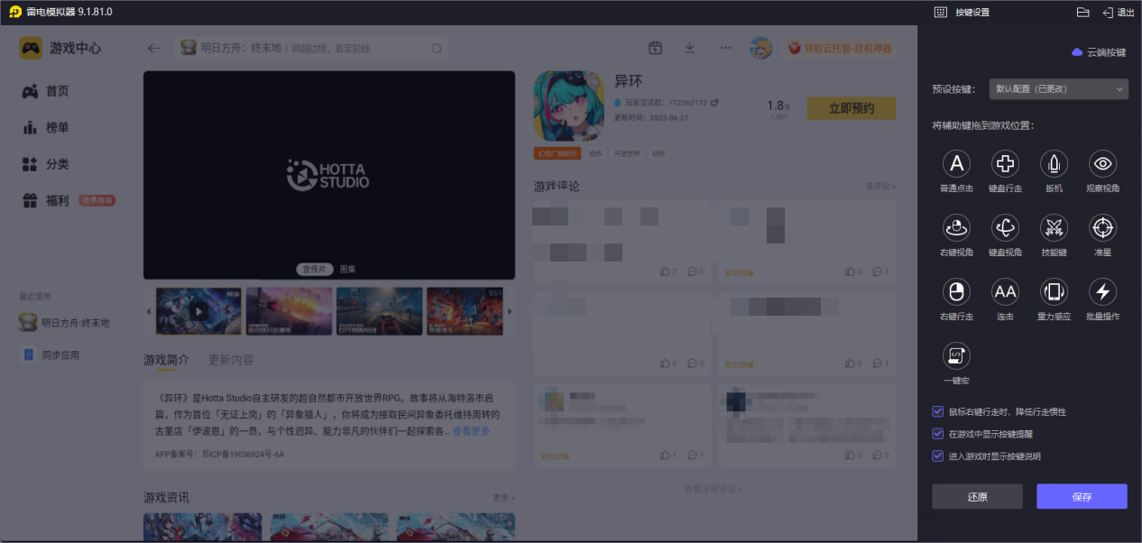 同时,雷电模拟器的竞技手感十分出色,能智能精准匹配异环的手机端键位,键鼠映射功能响应延迟极低,无需玩家进行复杂的手动调试即可快速上手。这让玩家在异环的战斗对抗和地图探索中,能够实现精准操作、灵活走位,彻底摆脱手机触屏误触的烦恼,大幅提升游戏竞技体验和操作上限。