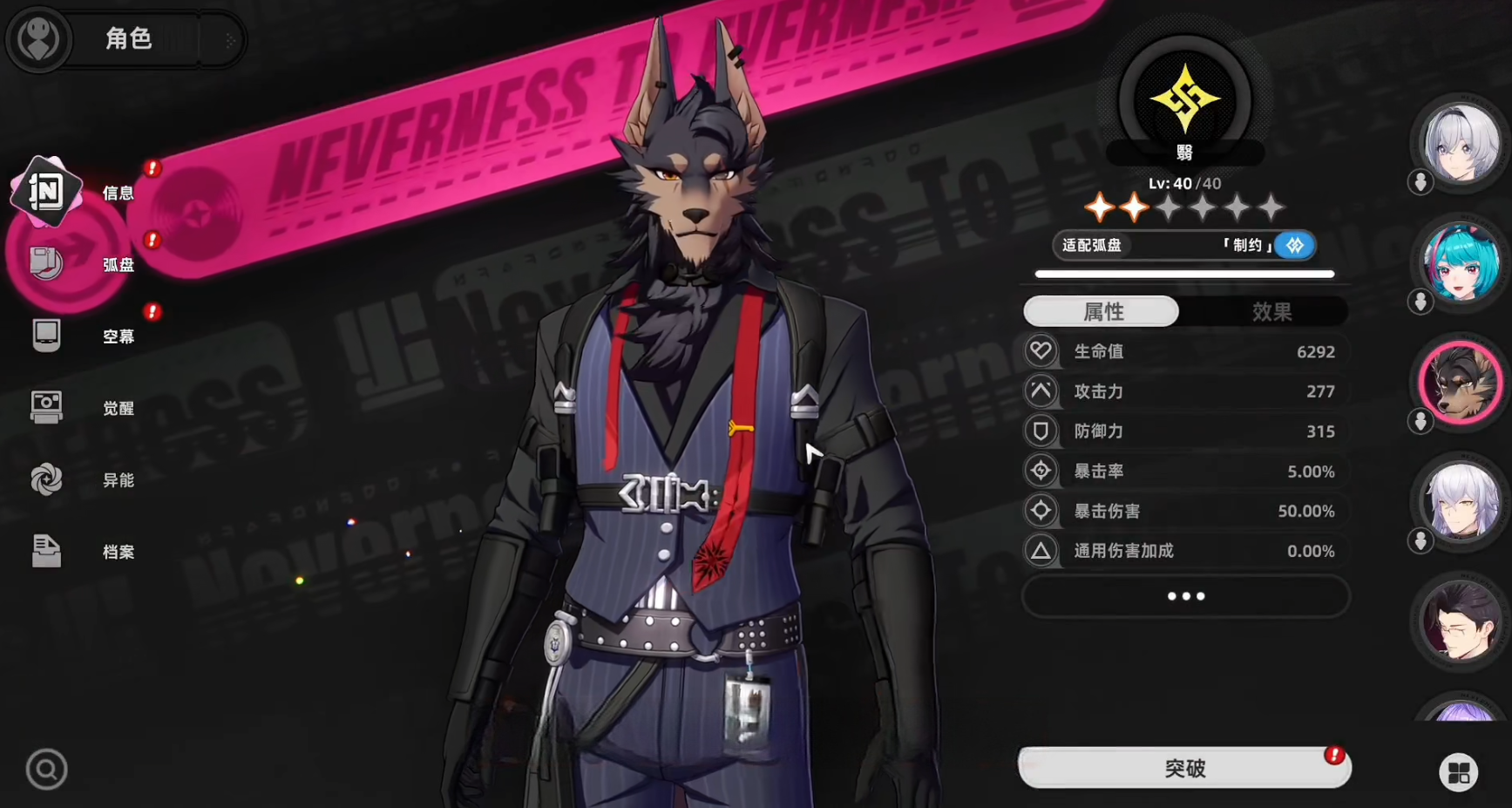 异环狼的真实名字是翳,他是意向管理局禁置机动队的副队长,有着狼首人身的独特外形。他平时穿着深蓝色的修身西装,战斗时会戴上狼头面具,整体风格沉稳又充满野性,辨识度非常高。他定位为近战突袭型输出,兼顾探索与战斗,是综合能力很强的核心角色。