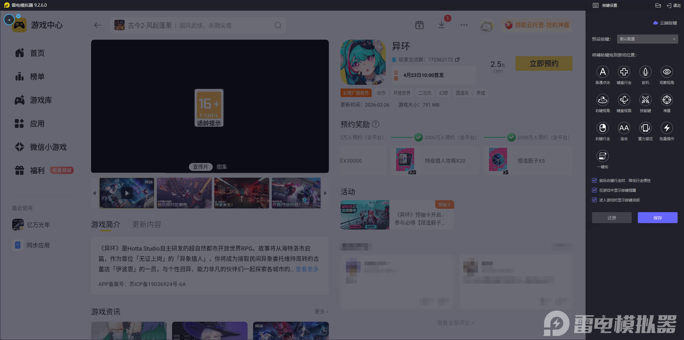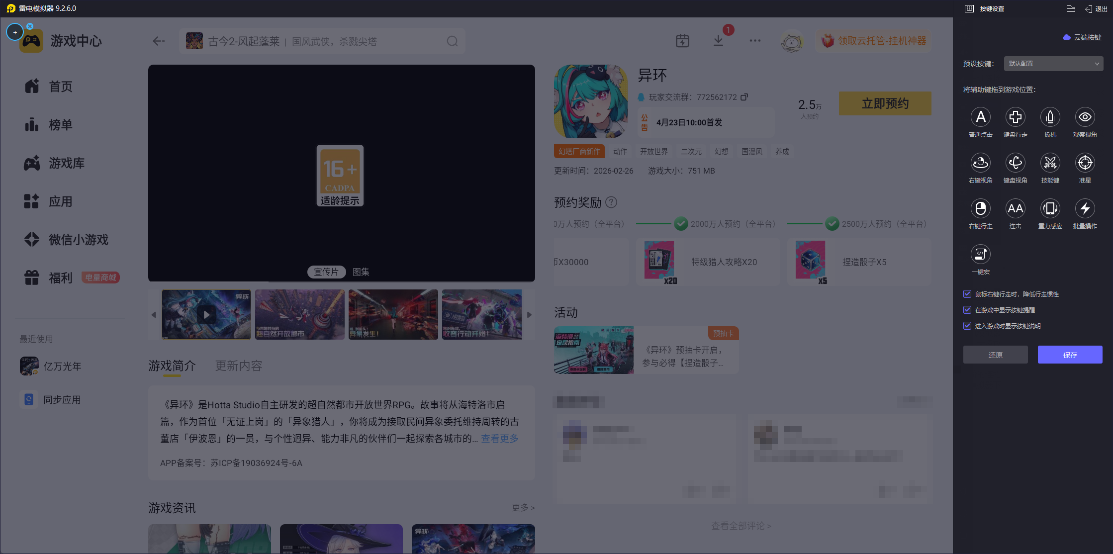 异环相位切换操作需要快速按键响应,触屏操作存在延迟且易误触。雷电模拟器支持键盘自定义映射,将异环相位切换操作绑定至空格键,普攻放左键、大招放右键,形成"ASWD移动+鼠标控制视角"的PC端标准操作逻辑。