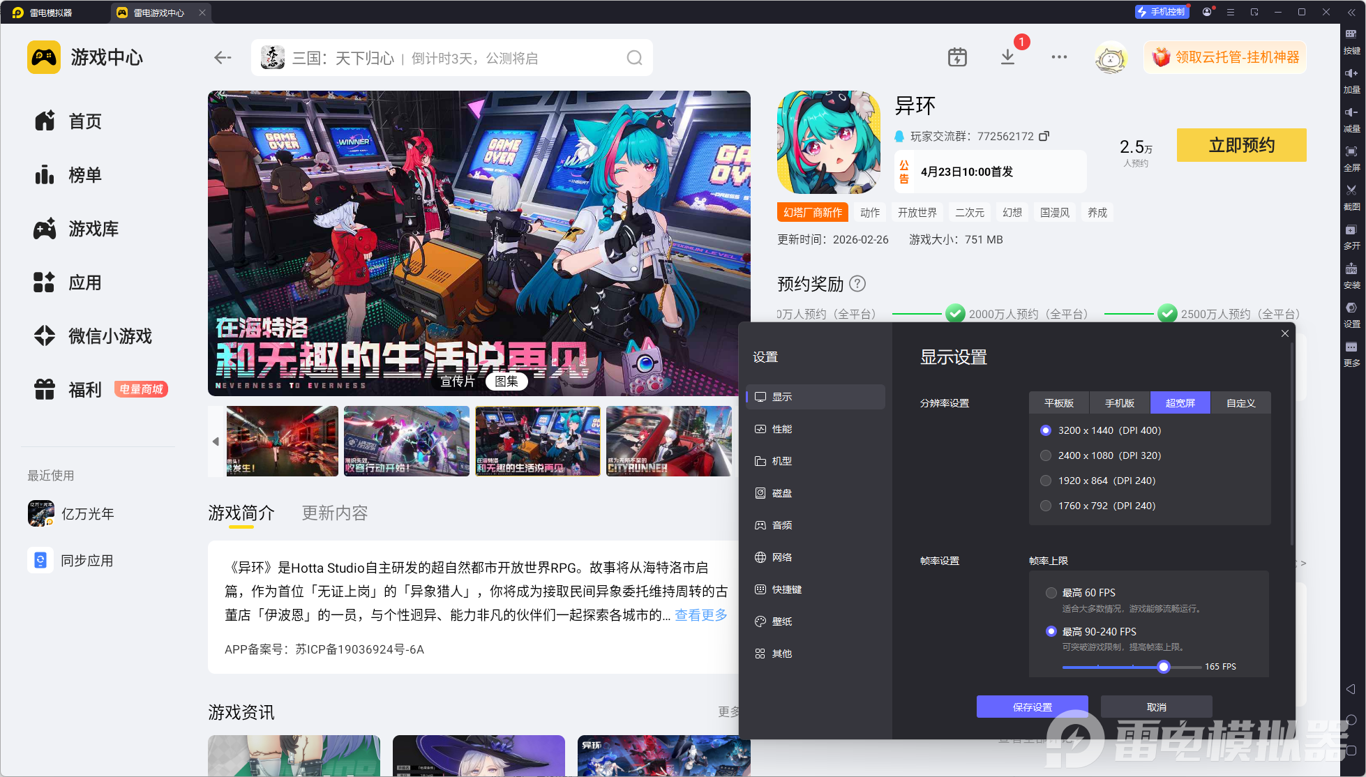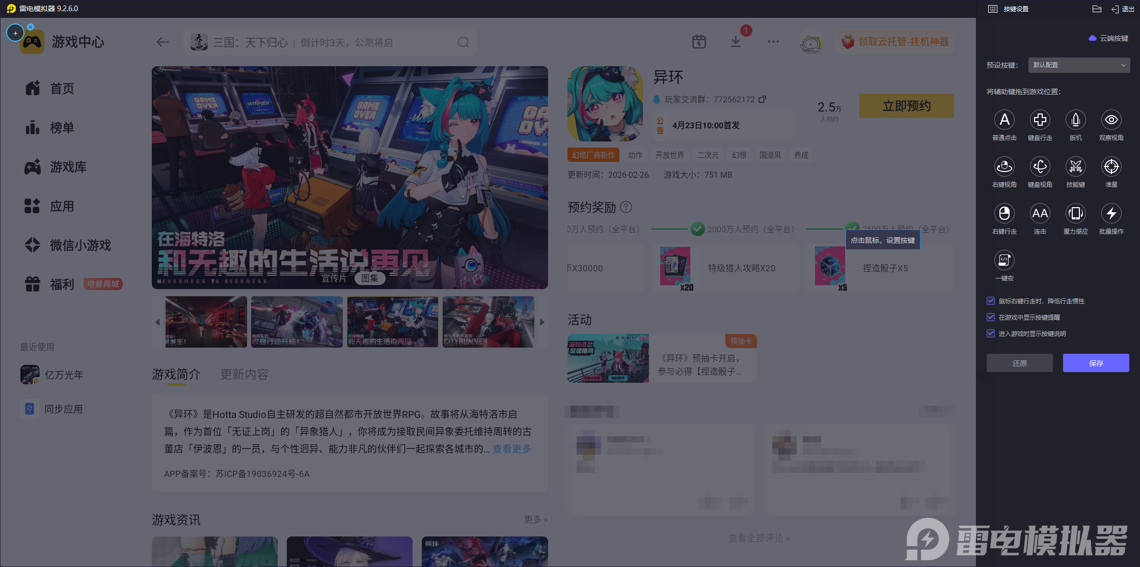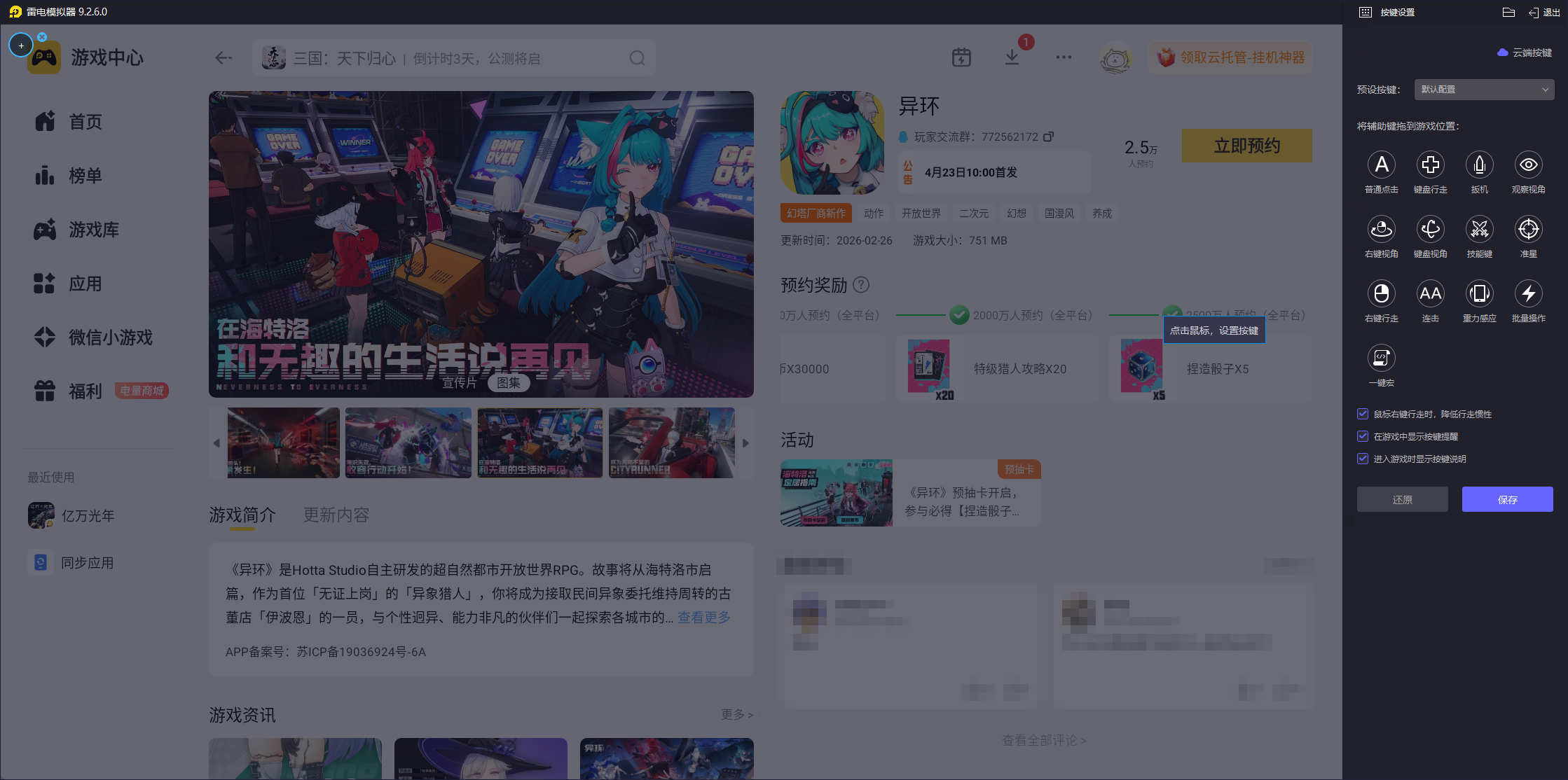 键鼠操作实现毫秒级响应。异环的时隙判定对输入延迟极度敏感,手机触屏存在约80ms的物理延迟,而雷电模拟器通过键盘映射可将延迟压缩至20ms以内。建议将共鸣键绑定至空格,角色技能分别映射Q/E/R,实现"左手移动、右手技能、拇指共鸣"的三线操作。