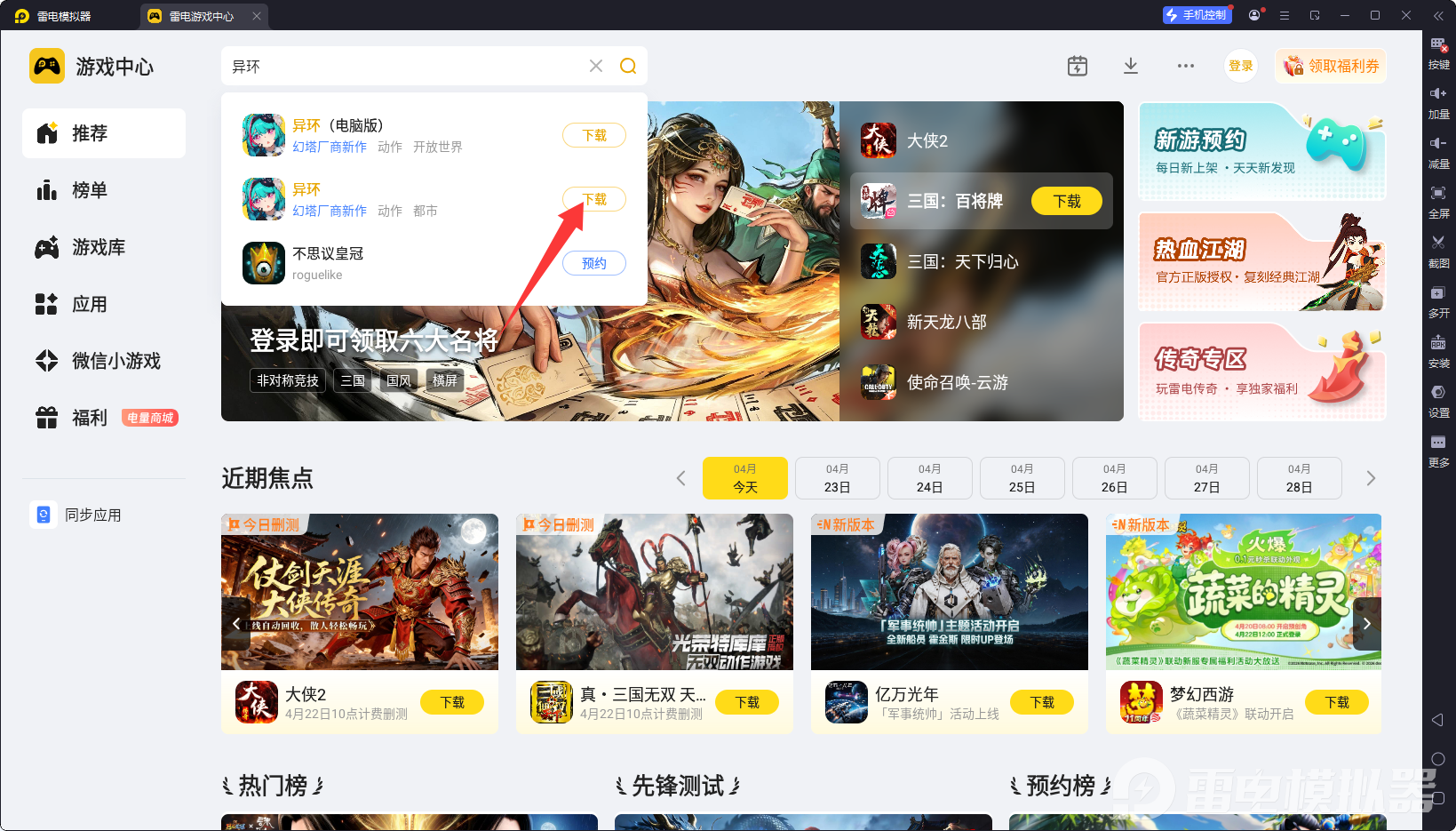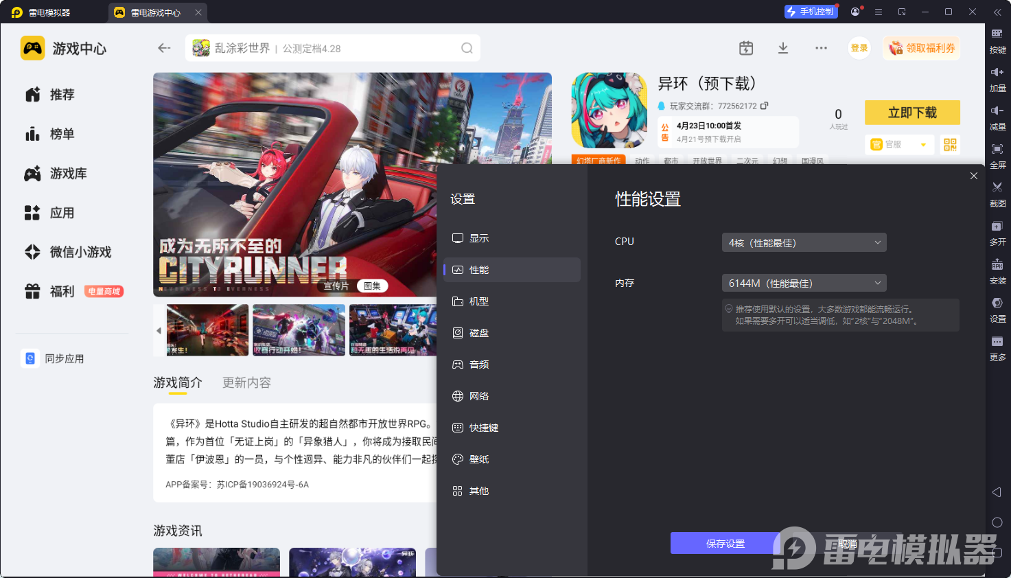安装完成并启动雷电模拟器后,进入内置的雷电游戏中心,在搜索栏输入异环目前游戏已开启预下载,安装完成后会出现在雷电模拟器,届时公测开启可直接进入游戏,快人一步。