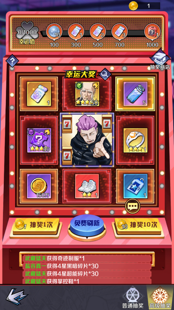 - 每次抽奖都能获得10点幸运值,达到1000幸运值可得幸运大礼包;
