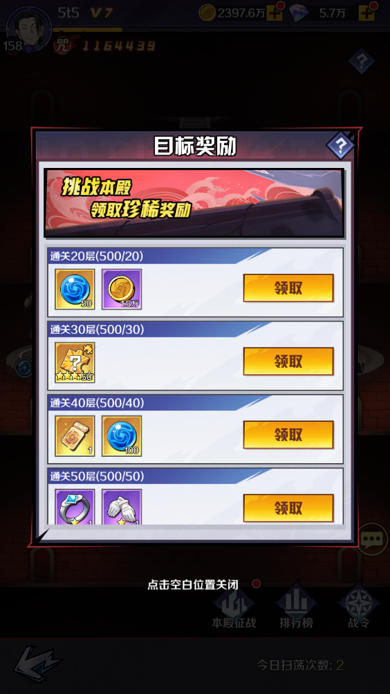 历练-薨星宫“本殿”属于爬塔玩法,每挑战过10层即可领取层数奖励。【薨星宫规则说明】:薨星宫首通可获得进阶石奖励,每10层额外领取1份通关奖励每一层首次挑战不消耗次数,已通关层可进行扫荡,每天有2次免费扫荡次数免费扫荡次数每天00:00刷新可消耗钻石购买挑战次数,每日限购3次注:内容仅供参考,实际以游戏内为准。