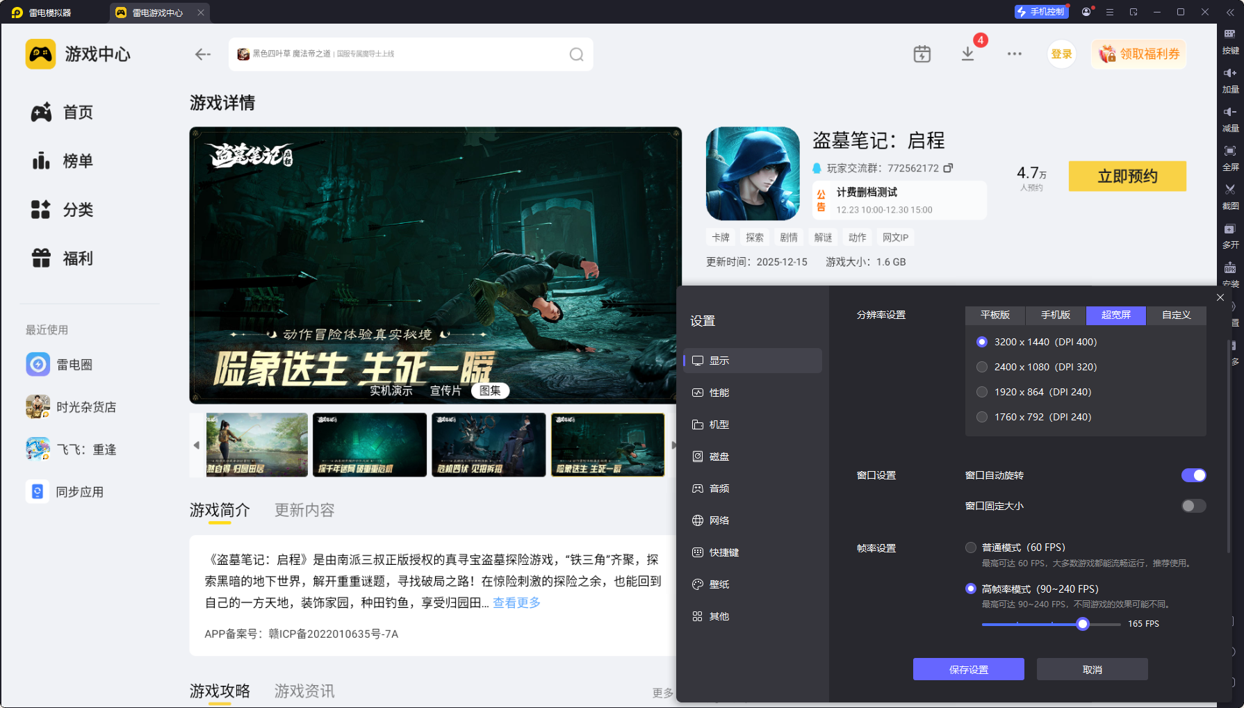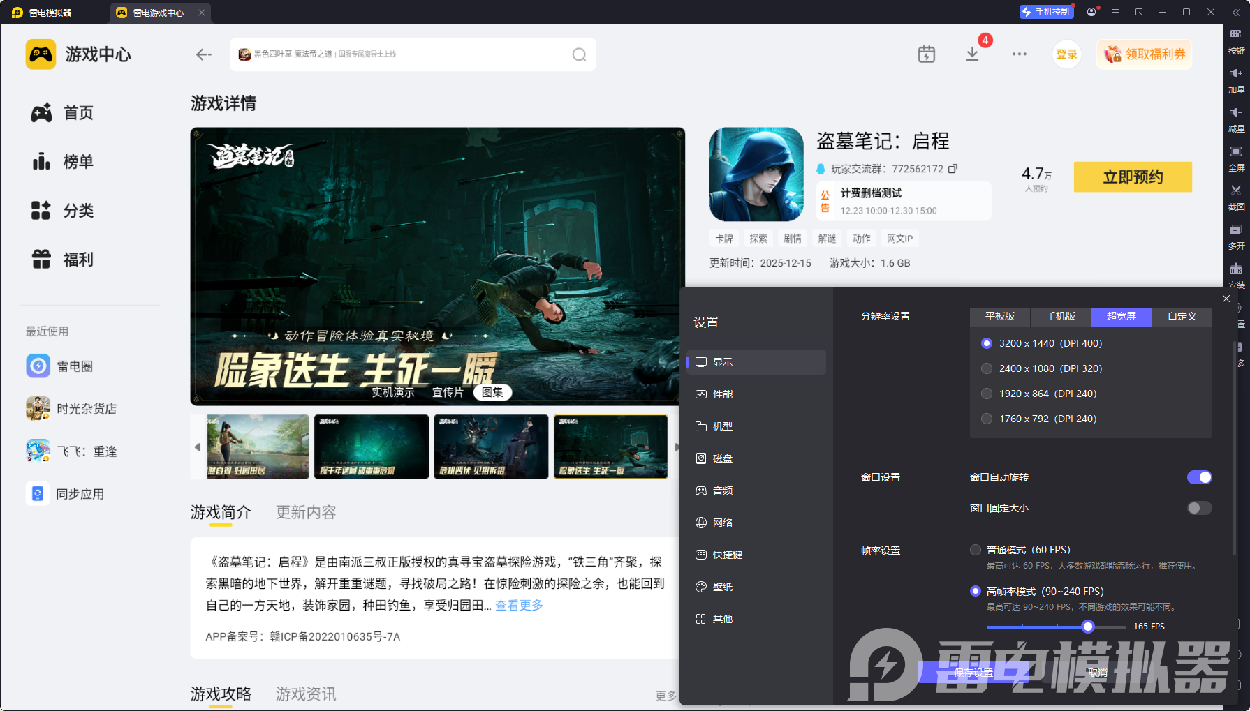 新手探索古墓时,常因画面模糊错过机关线索、看不清道具提示而卡关。用雷电模拟器玩《盗墓笔记启程》,可一键设置高分辨率,支持4K超清显示,古墓墙壁的纹路、机关的细微构造都能清晰呈现。而且可以稳定保持165帧率,即便战斗中技能特效密集叠加,也能保持稳定运行,让你精准捕捉隐藏宝箱位置和解谜关键信息,探索之路更顺畅。