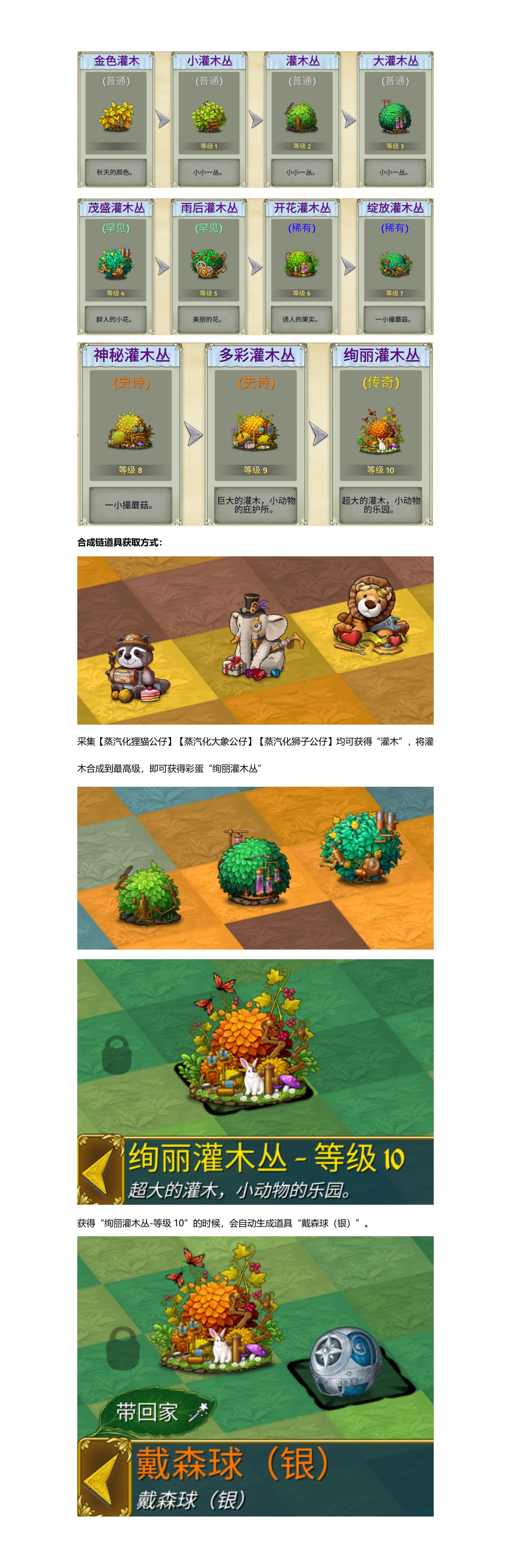 戴森球(银)获取方式:采集【蒸汽化狸猫公仔】【蒸汽化大象公仔】【蒸汽化狮子公仔】均可获得“灌木”,将灌木合成到最高级,即可获得彩蛋“绚丽灌木丛”同时会自动生成道具“戴森球(银)”。