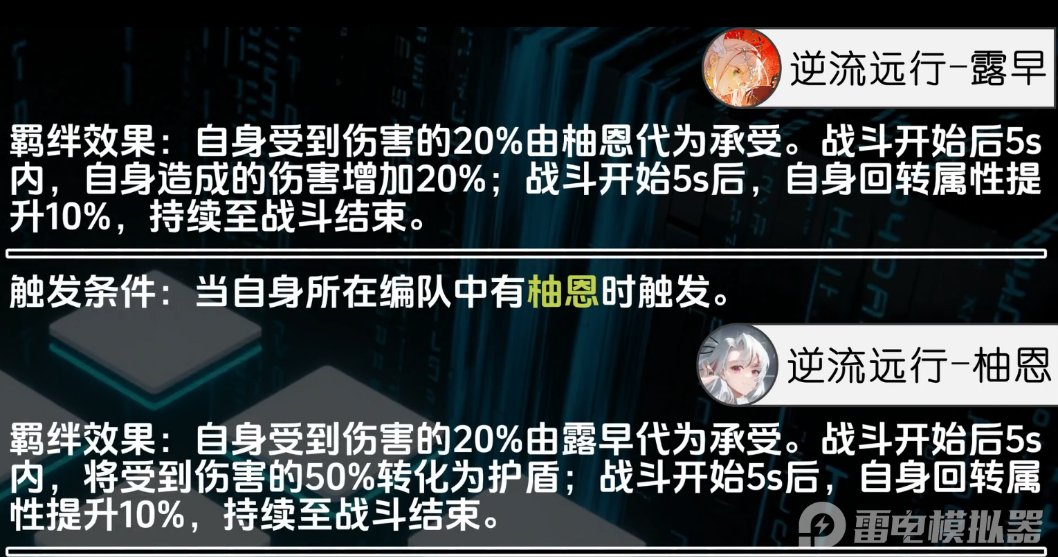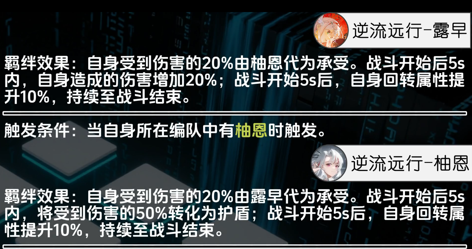 虚环柚恩的强度离不开合理操作与阵容搭配,她的支援技能能在队友护盾破裂时反击,装备技能“沉重的晚安”还能强化破盾能力,是虚环中兼具输出与支援的实用角色。结合其护盾依赖特性,最适配的配队是露早+泽音,三者组成三位一体的协作体系,能完美弥补虚环柚恩持久战中护盾不足的短板,最大化其战力。