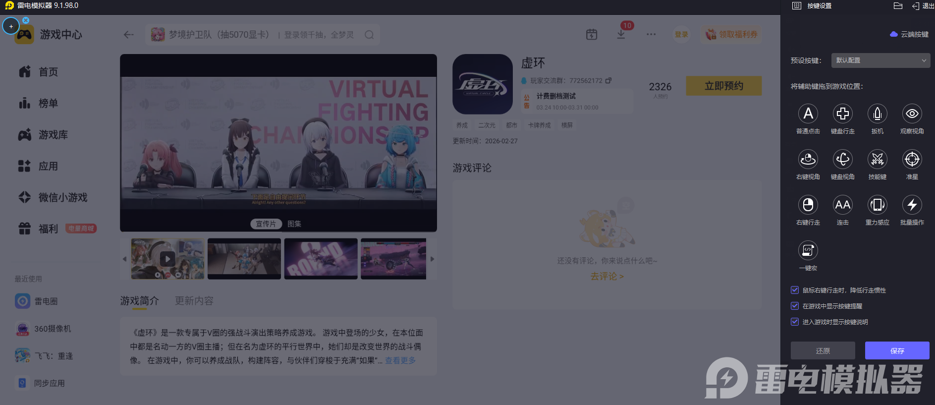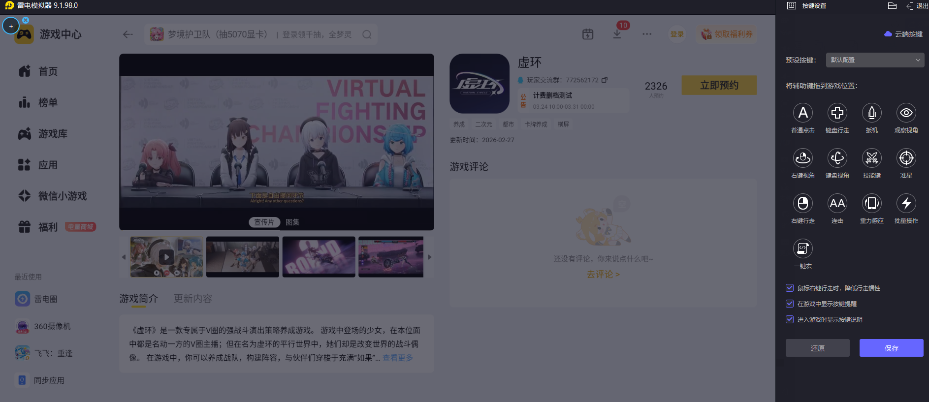 触屏游玩虚环时,手指与屏幕的接触容易出现操作偏差,雷电模拟器支持键鼠自定义映射功能,将虚环的各项操作对应到键盘按键与鼠标操控上,每一个指令、每一次技能释放都能精准触发,不会出现触屏误触的问题,复杂操作也能轻松完成,让游戏的操作更高效顺手。