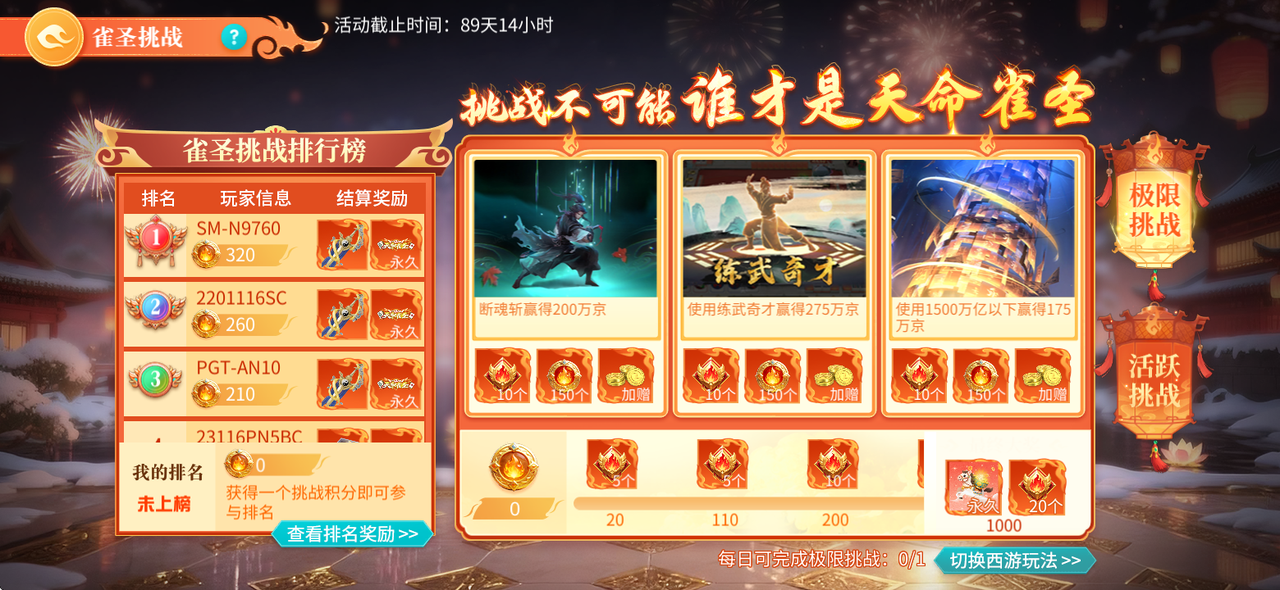 分为活跃挑战和极限挑战玩法,达成挑战目标可以获得挑战积分和西行币,以及限定装扮。