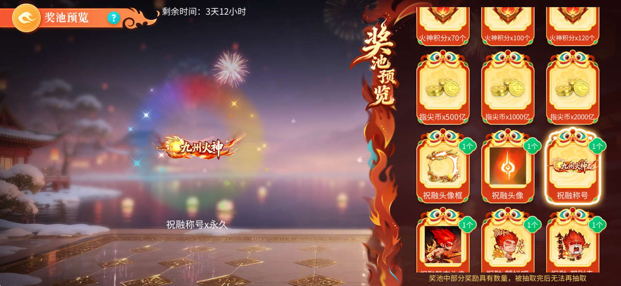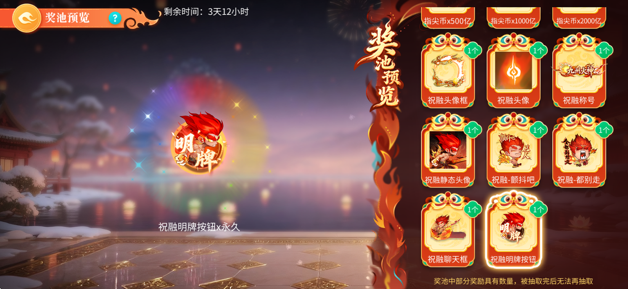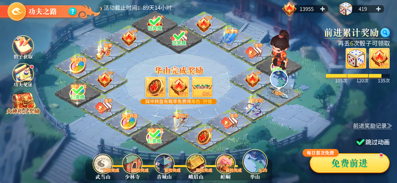 活动内容都可以获得功夫骰子,使用骰子在棋盘上前进,每一次前进都可以触发一个事件或者获得一份奖励。通过棋盘冒险来收集宝物点亮功夫见证获得奖励,还有转盘大奖有概率获得角色狩猎。