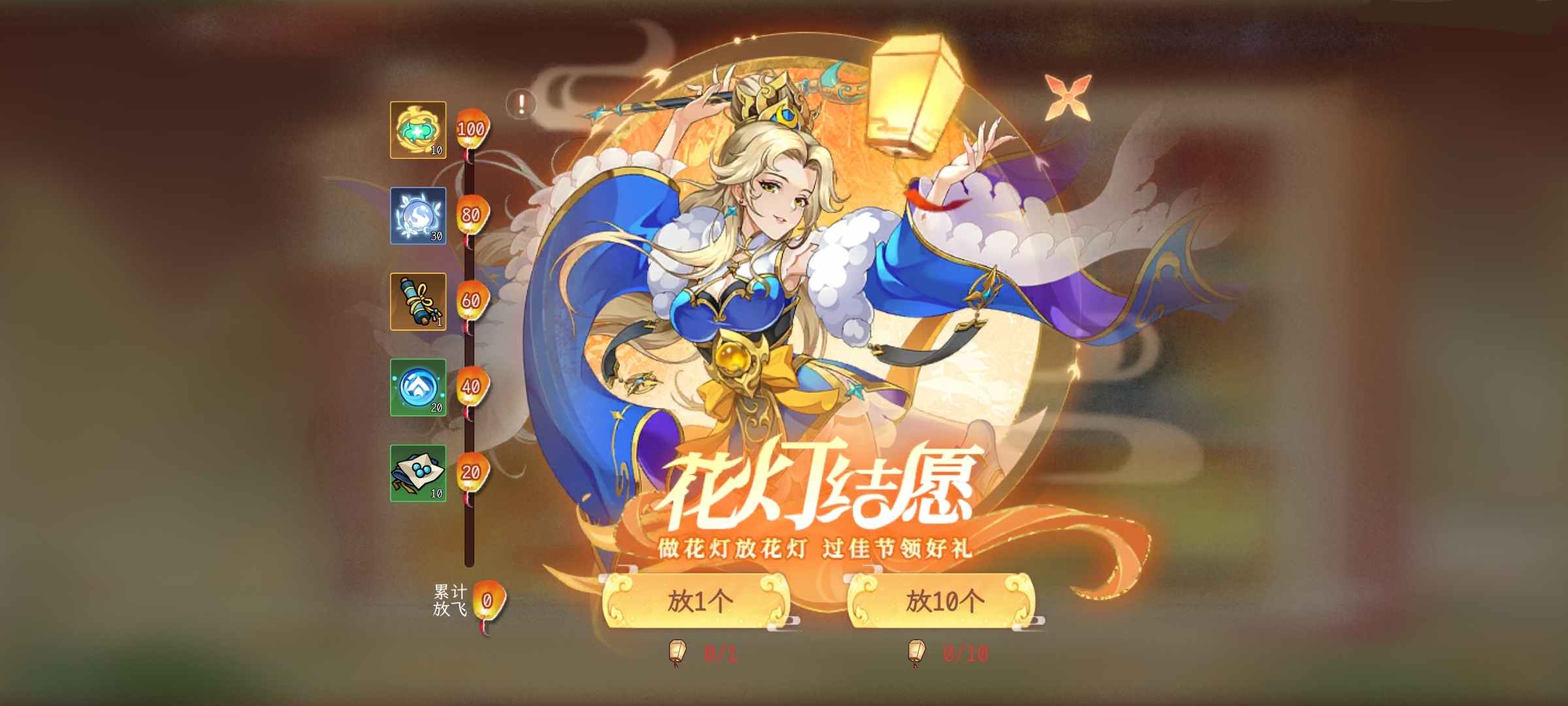 活动内容:活动期间,收集材料制作花灯,每次放花灯都可随机获得道具奖励,累计放飞一定数量花灯可获得额外的奖励。