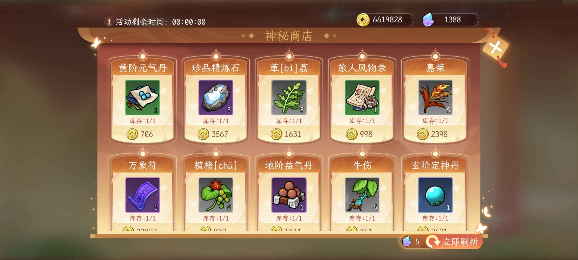 活动内容:活动期间,每天0点随机刷新商品,使用铜钱购买心仪道具,可用灵石刷新商店。
