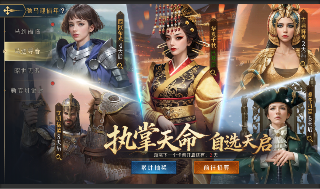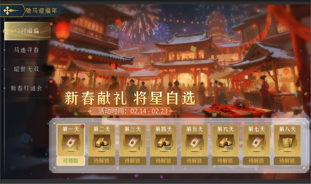 福至帝国,满载而归!喜迎福年之际,我们诚邀各位玩家共赴「驰马迎福年」庆典!本次新春活动将于2026年2月14日至2月23日隆重开启,带来四大精彩板块:登录即领豪礼的「马到福临」、阵营卡包任选的「马迹寻春」、邂逅全新英雄周公旦的「昭世无双」,以及趣味解谜赢好礼的「新春灯谜会」。活动详情请以游戏内为准,记得准时参与哦~