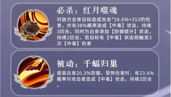 必杀技红月噬魂,回合中可对敌方全体造成伤害,有概率附加中毒状态,同时给自己叠加防御提升效果。