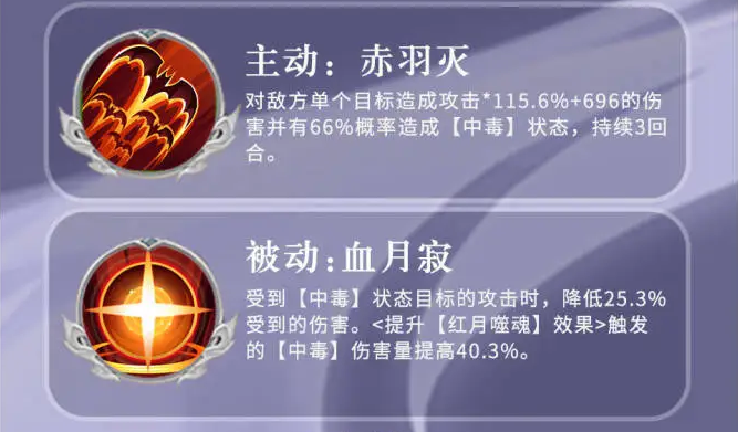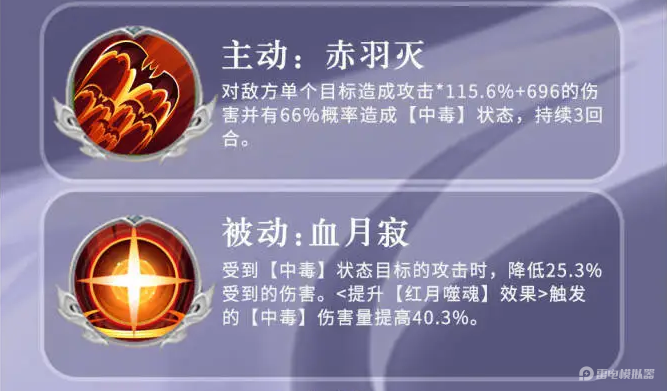 主动技赤羽灭,主打单体补毒,对单个敌方目标造成高额伤害,同样有概率施加中毒,专门针对敌方主C或残血单位补伤挂毒。