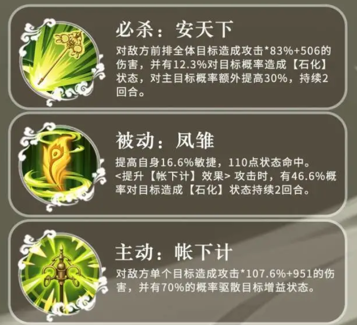 庞统的技能机制围绕群体控制与驱散展开。他的主动技能可以对敌方全体造成伤害,并有概率附加眩晕或沉默状态;零怒技能则能驱散我方负面效果,同时削弱敌方增益。依靠高额的状态命中加成,庞统的控制成功率非常可观,是组建控制队的首选武将之一。