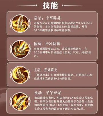 魏延的技能设计围绕群攻与克制高血量单位展开,主动技“直捣黄龙”可在普攻时附带横扫效果,对目标左右单位造成额外伤害,大幅提升群攻覆盖能力;必杀技“千军辟易”能对敌方及两侧目标造成高额伤害,还能大概率驱散目标增益状态,打乱敌方作战节奏。其被动技能“子午奇谋”更是核心,造成直接伤害时可附加目标生命上限百分比的伤害,面对肉盾或高血量辅助时能打出超额伤害,实用性拉满。