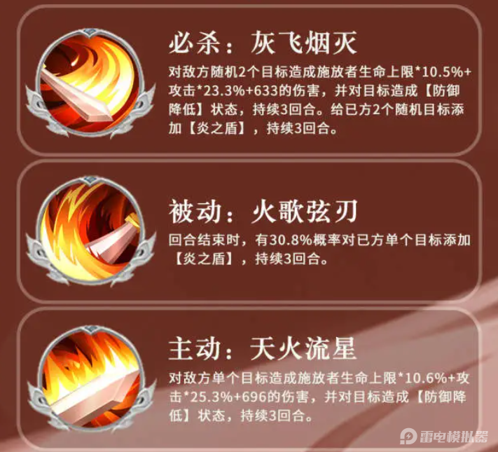 主动:天火流星:对敌方单体造成生命上限与攻击加成的伤害,同样附加防御降低效果,是周瑜在回合内压制敌方核心的常用手段。