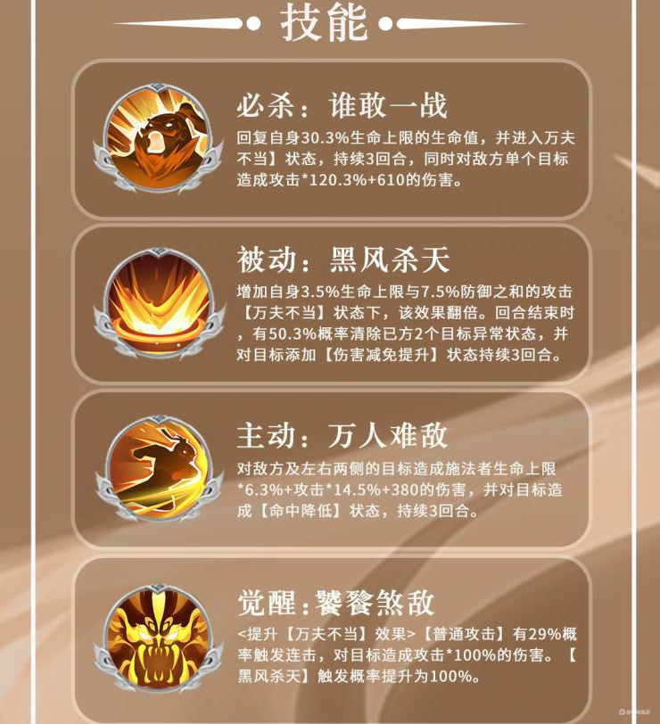 必杀技“谁敢一战”释放后不仅能够恢复自身一定比例的生命值,还会进入强化状态。主动技能“万人难敌”对目标及其周围单位造成范围伤害,并附带降低命中的效果。削弱敌人的进攻效率的同时帮助队伍建立优势。被动能力在回合结束时有概率为队友净化异常状态,避免控制效果持续叠加。