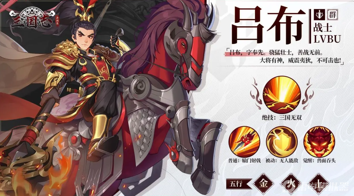 吕布:觉醒技能提升攻击系数,大招偷取敌方增益并转移减益,主目标伤害极高,触发概率随等级增强。