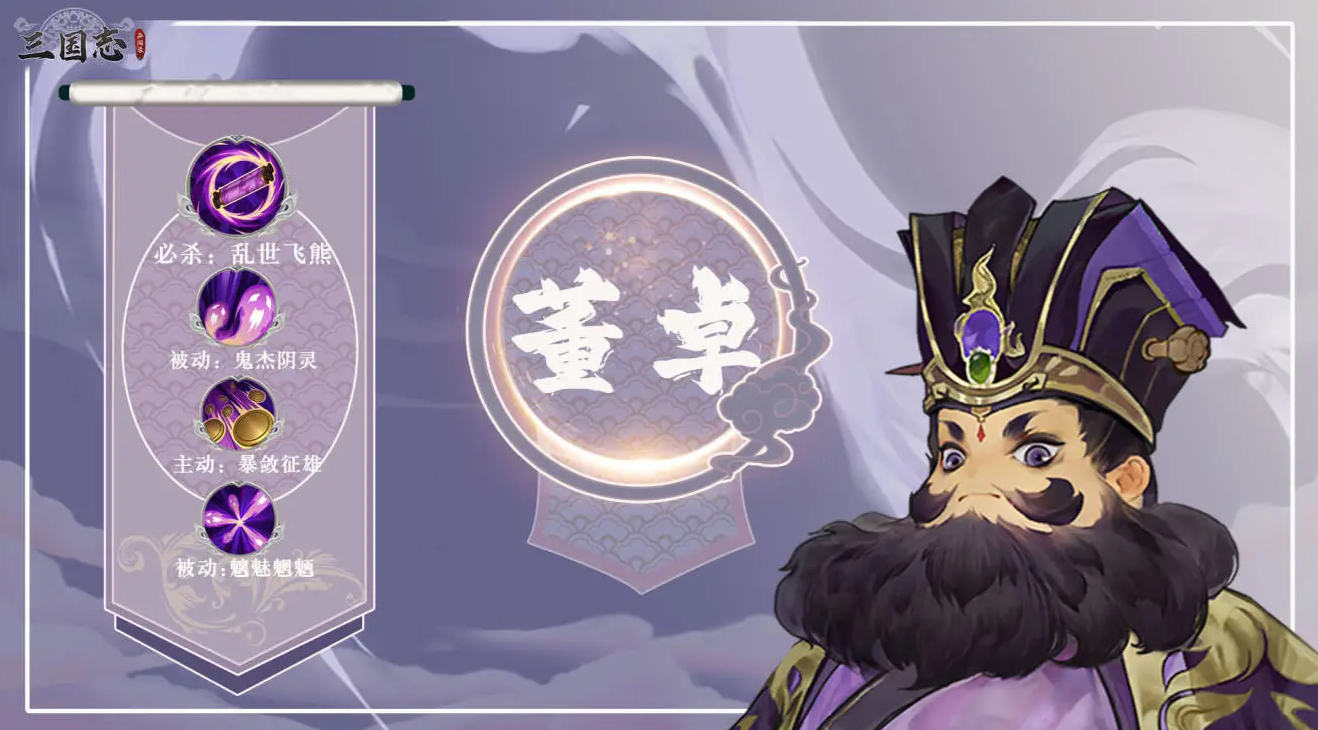 董卓:主动技给敌方添加“崩坏”状态,必杀技附加20%暴击和命中,击杀目标可叠加“暴虐”层数提升输出,并有概率沉默敌方。