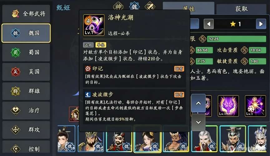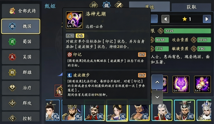 甄姬的技能以保护与控制为核心,兼顾法术输出。必杀技能“洛神光潮”可对单体目标造成远程伤害并施加印记,同时自身进入“凌波微步”状态,下一回合会优先攻击印记目标或血量最低的敌人,并无视部分防御,在面对高防单位时依然能打出不错伤害;另一主动技能“冰封一击”则在造成法术打击的同时有概率冰冻目标,能够有效打断敌方节奏。甄姬还能为队友提供护盾与速度加成,并驱散敌方部分增益效果,觉醒后还会获得一定的自我恢复能力。